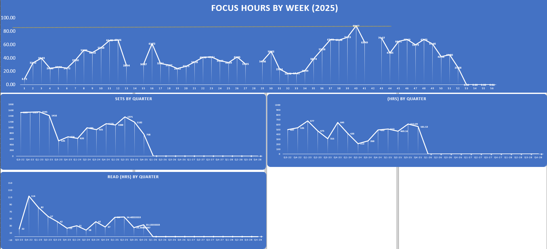 - Quarterly Graphs: Exercise sets by quarter, reading mins by quarter, focus hours by quarter.