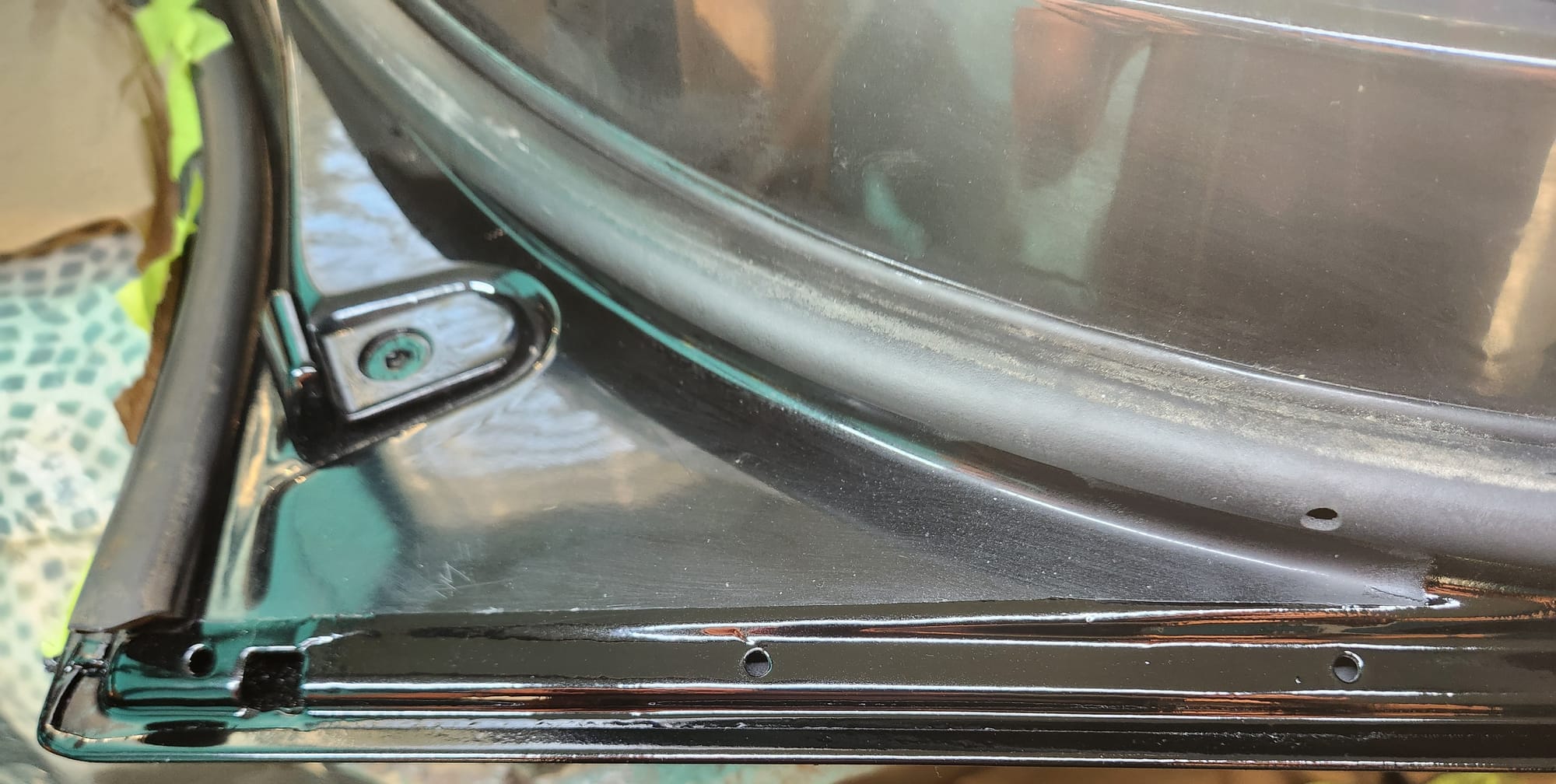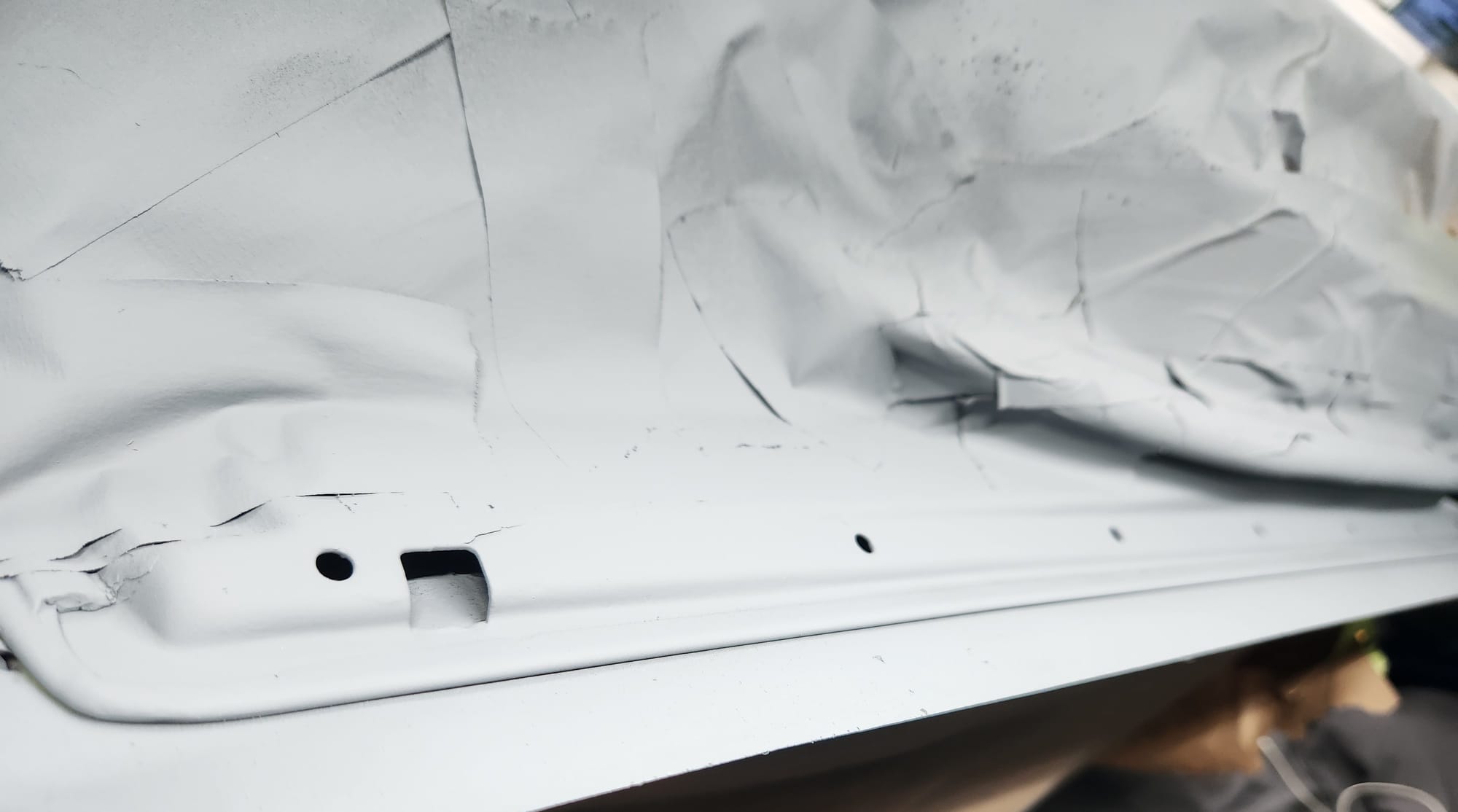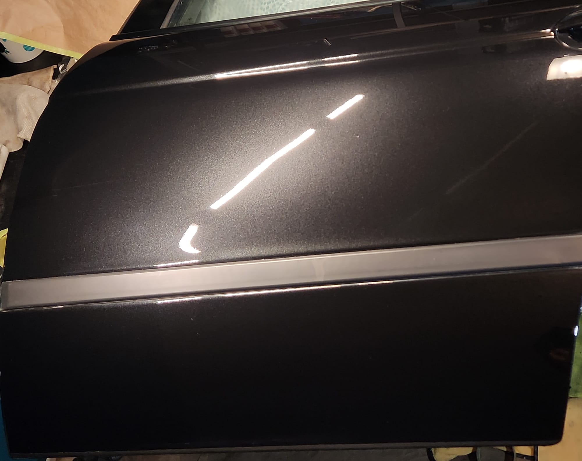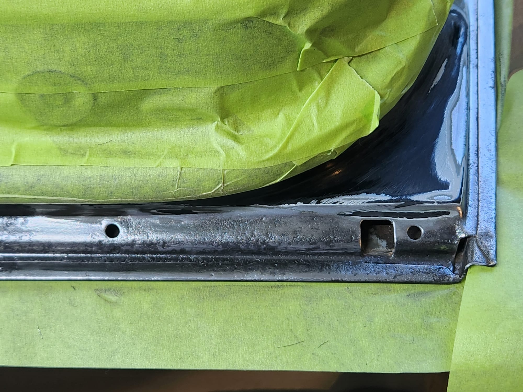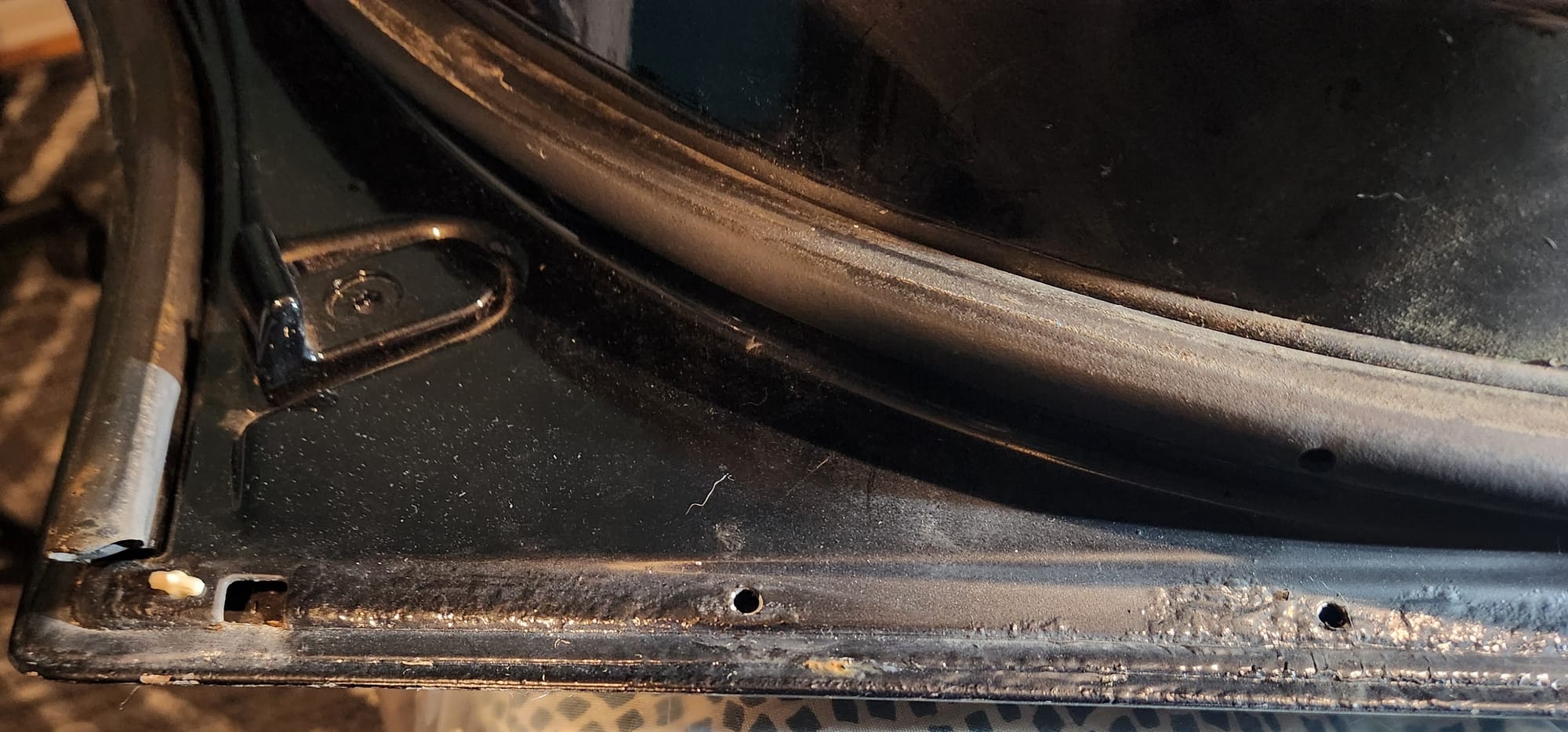 - Inspecting the Other Side: Flipped the door over for a closer inspection. While rust wasn't a major issue, there were scratches I aimed to remove. Noticed running clear coat, suggesting a previous repaint, which I planned to correct with wet sanding to address both the scratches and the uneven clear coat.