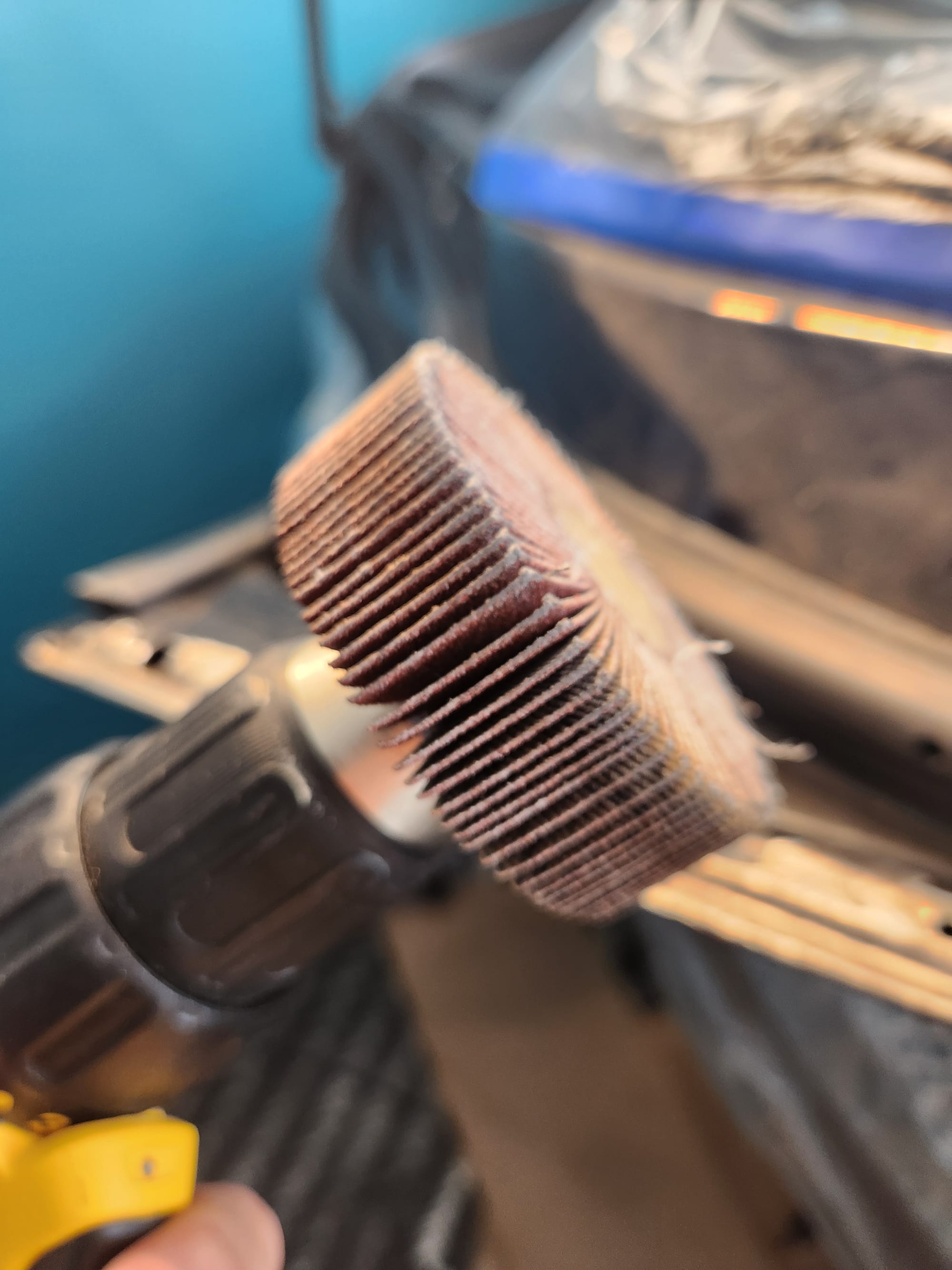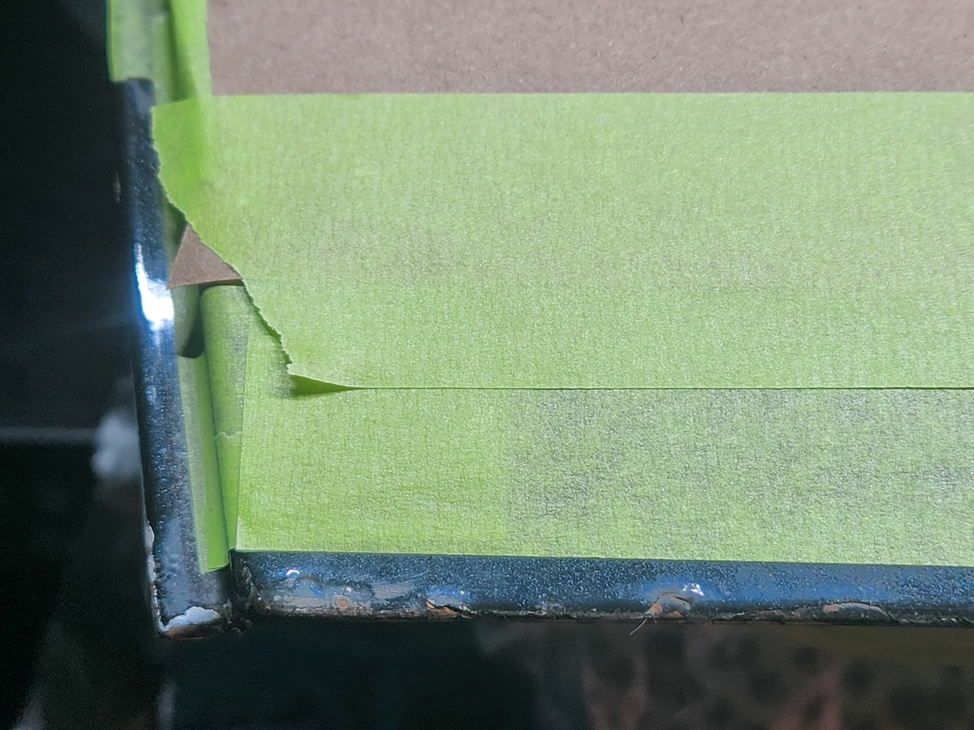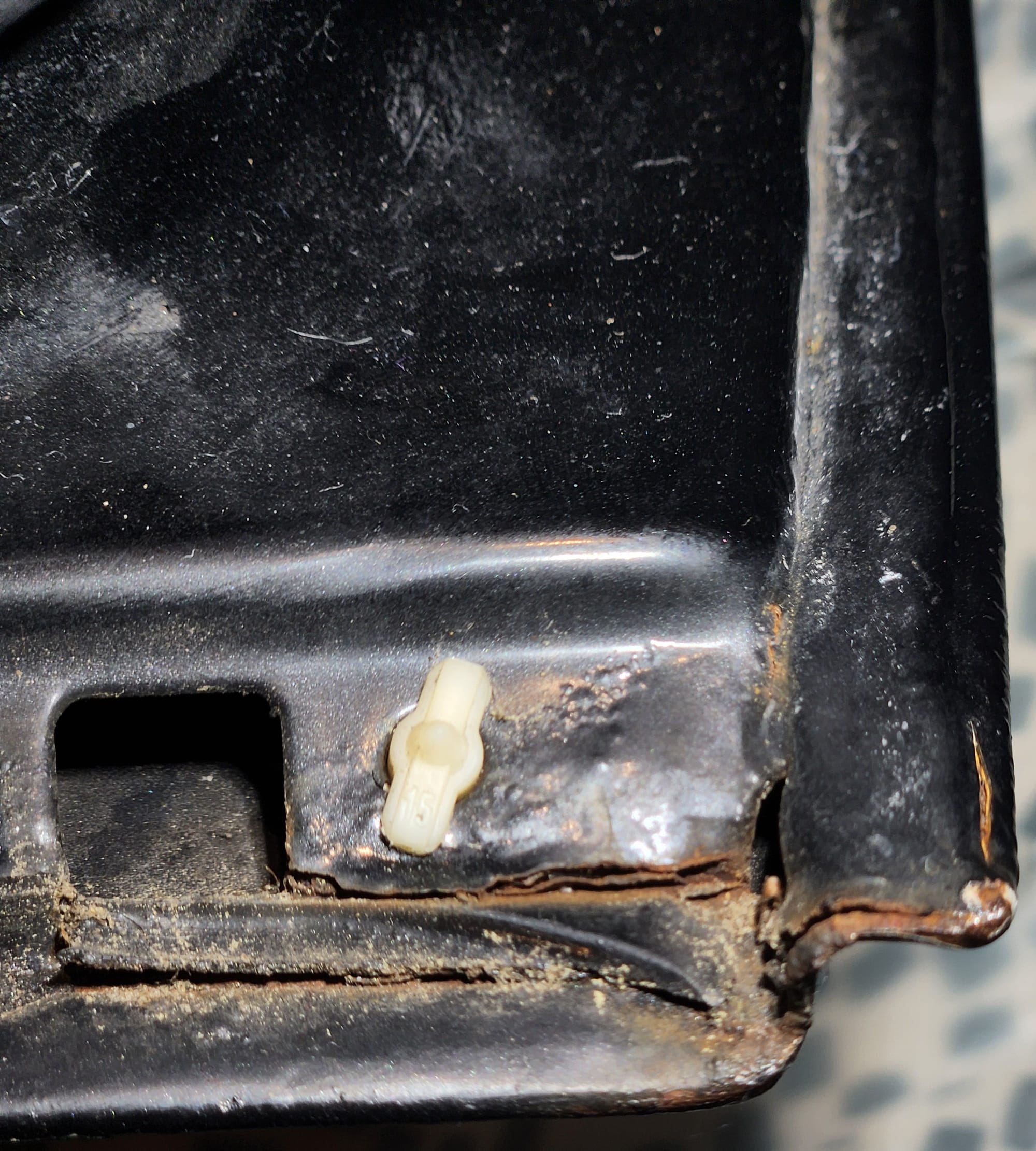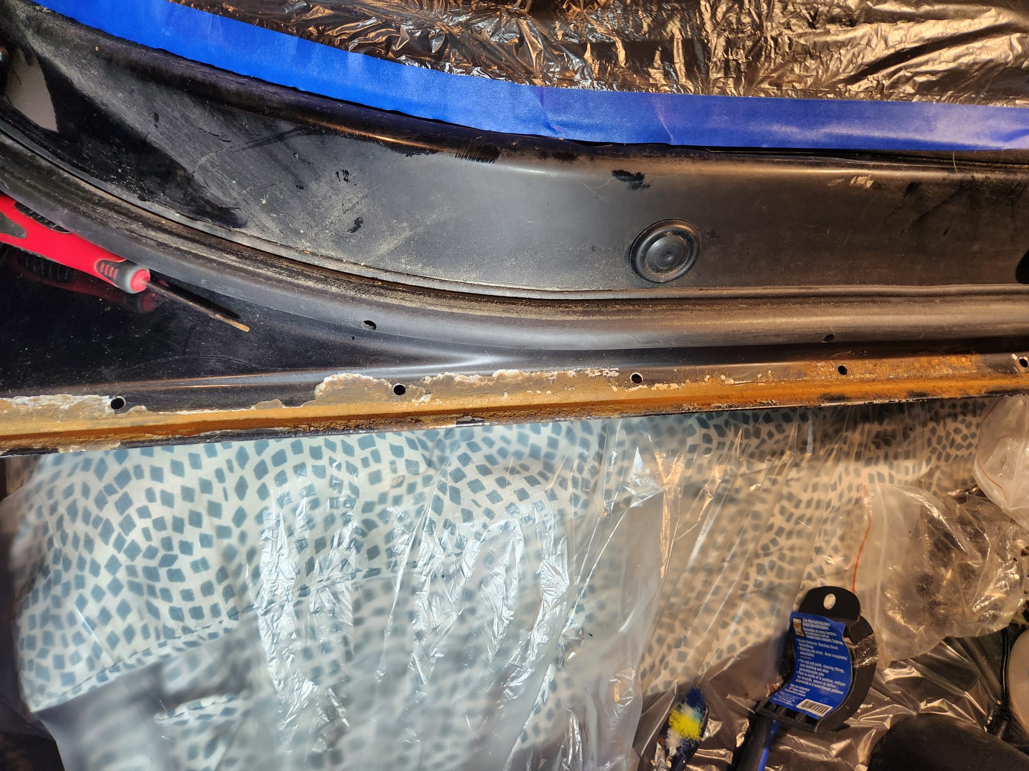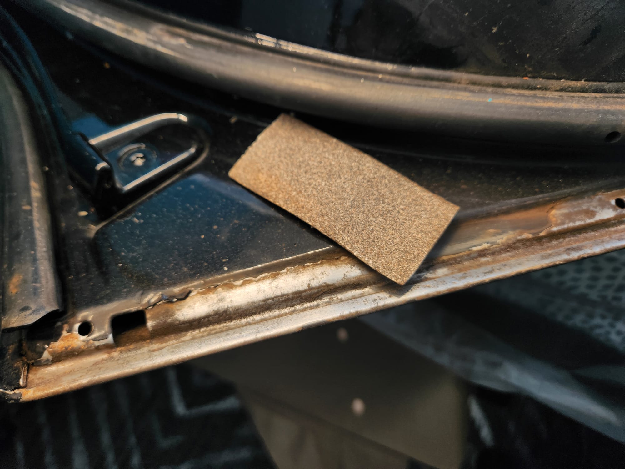 - Accessing Hard-to-Reach Areas: Wrapped 100 grit sandpaper around a plastic card to access the edges where sheet metal folds met, reaching the bare metal for thorough rust removal.