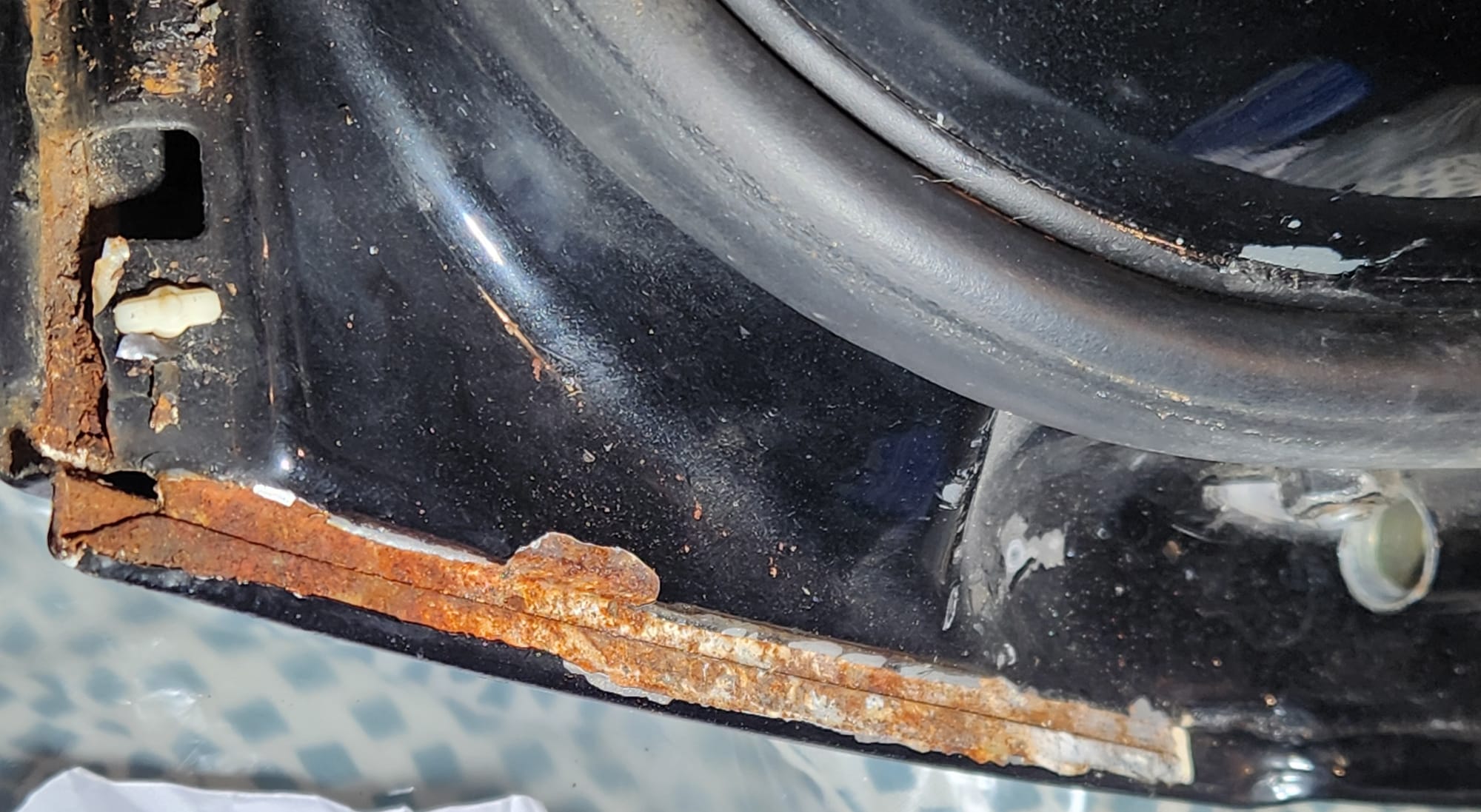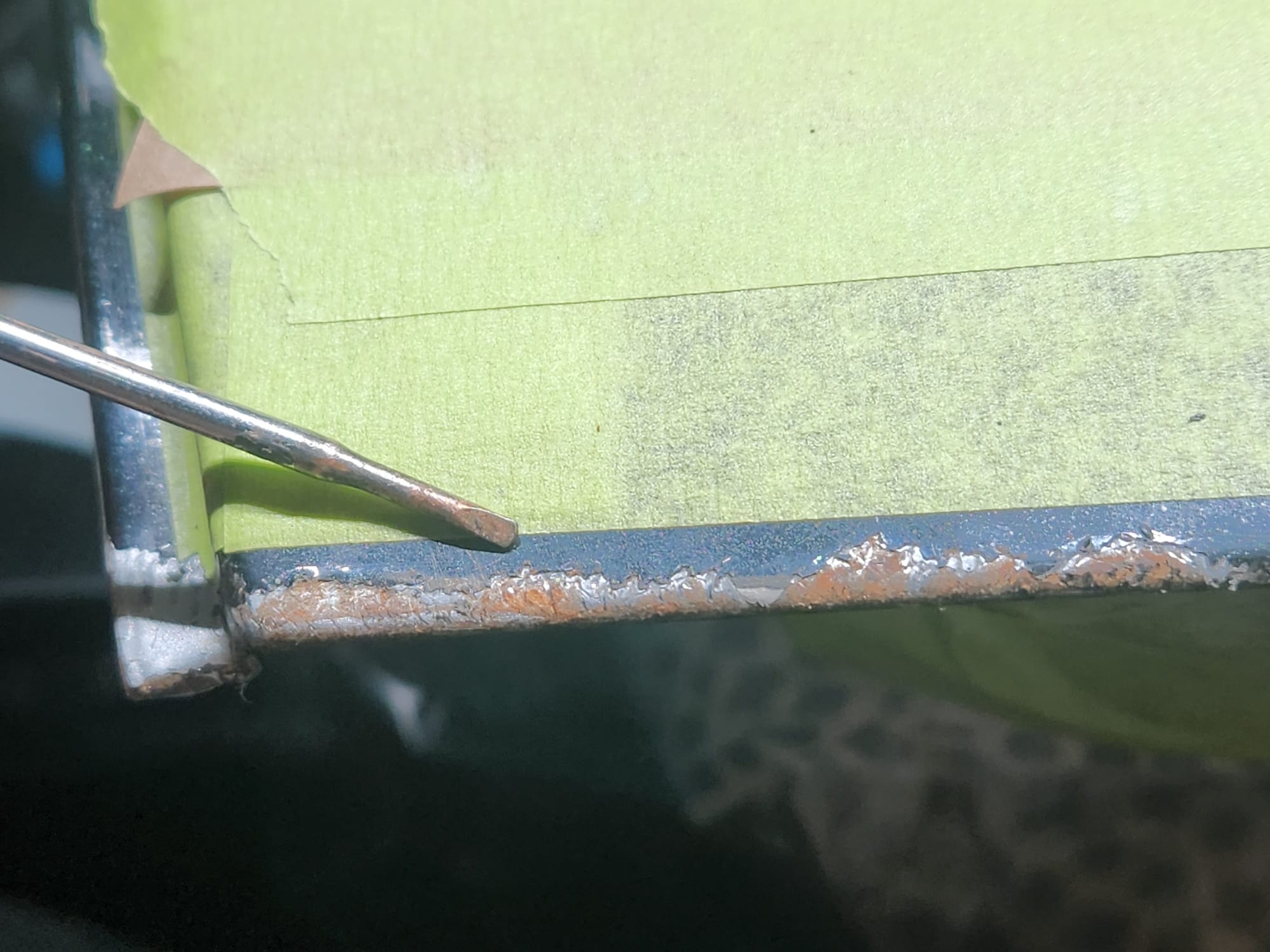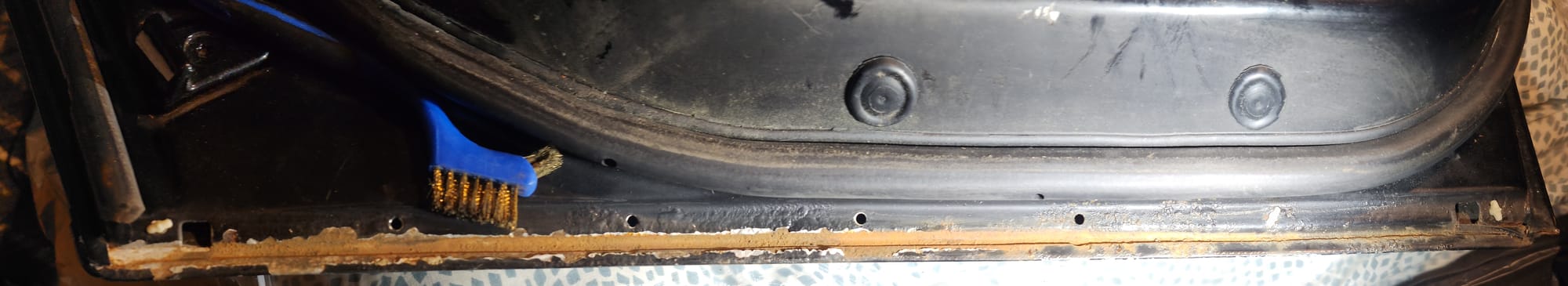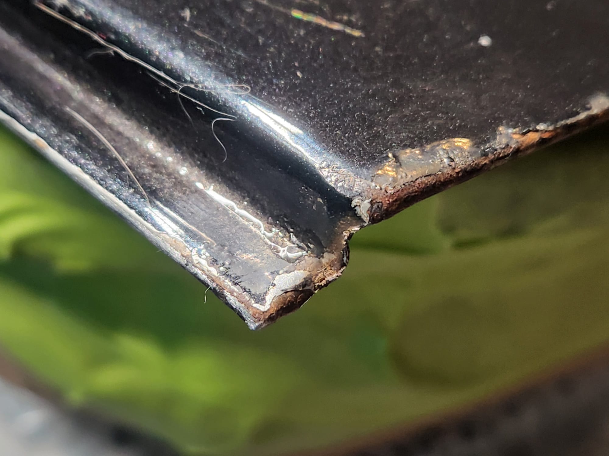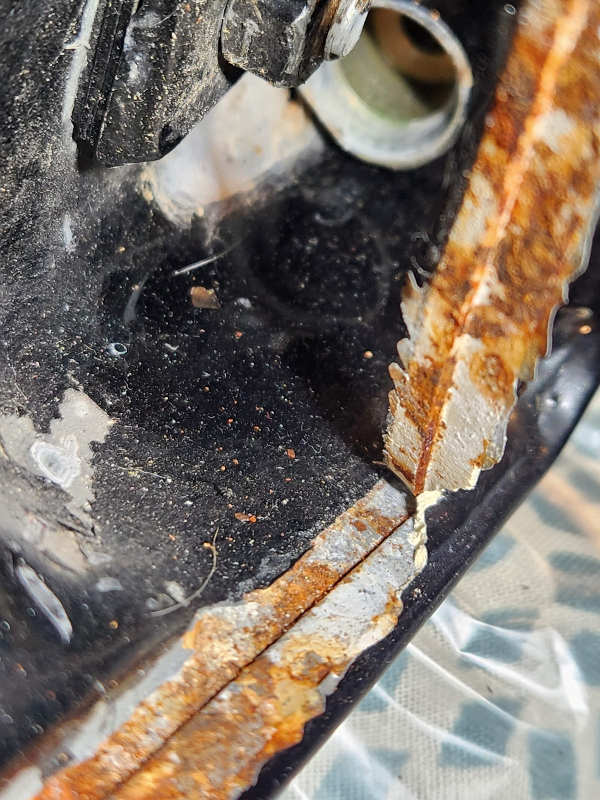 - Inspect for Damage: Examined the interior and exterior lower edge, identifying paint bubbling. Used a sharp small flat-head screwdriver and metal wire brush to aggressively scrape off the affected areas.