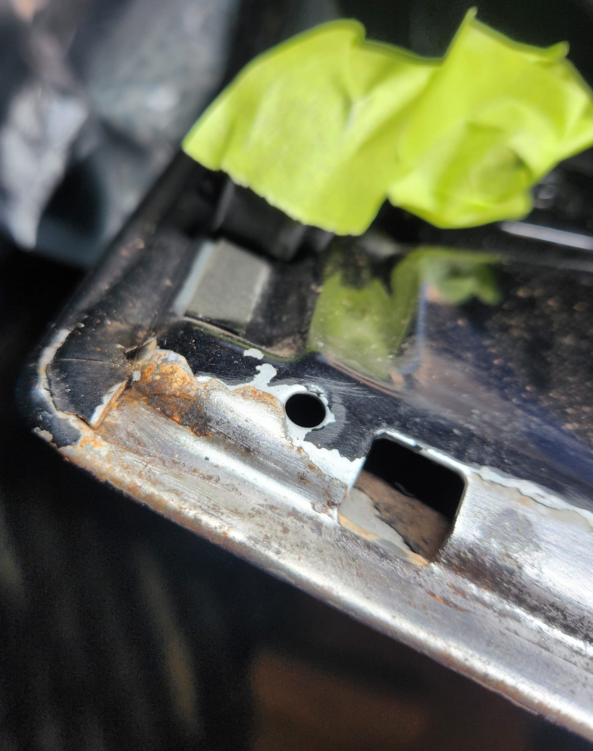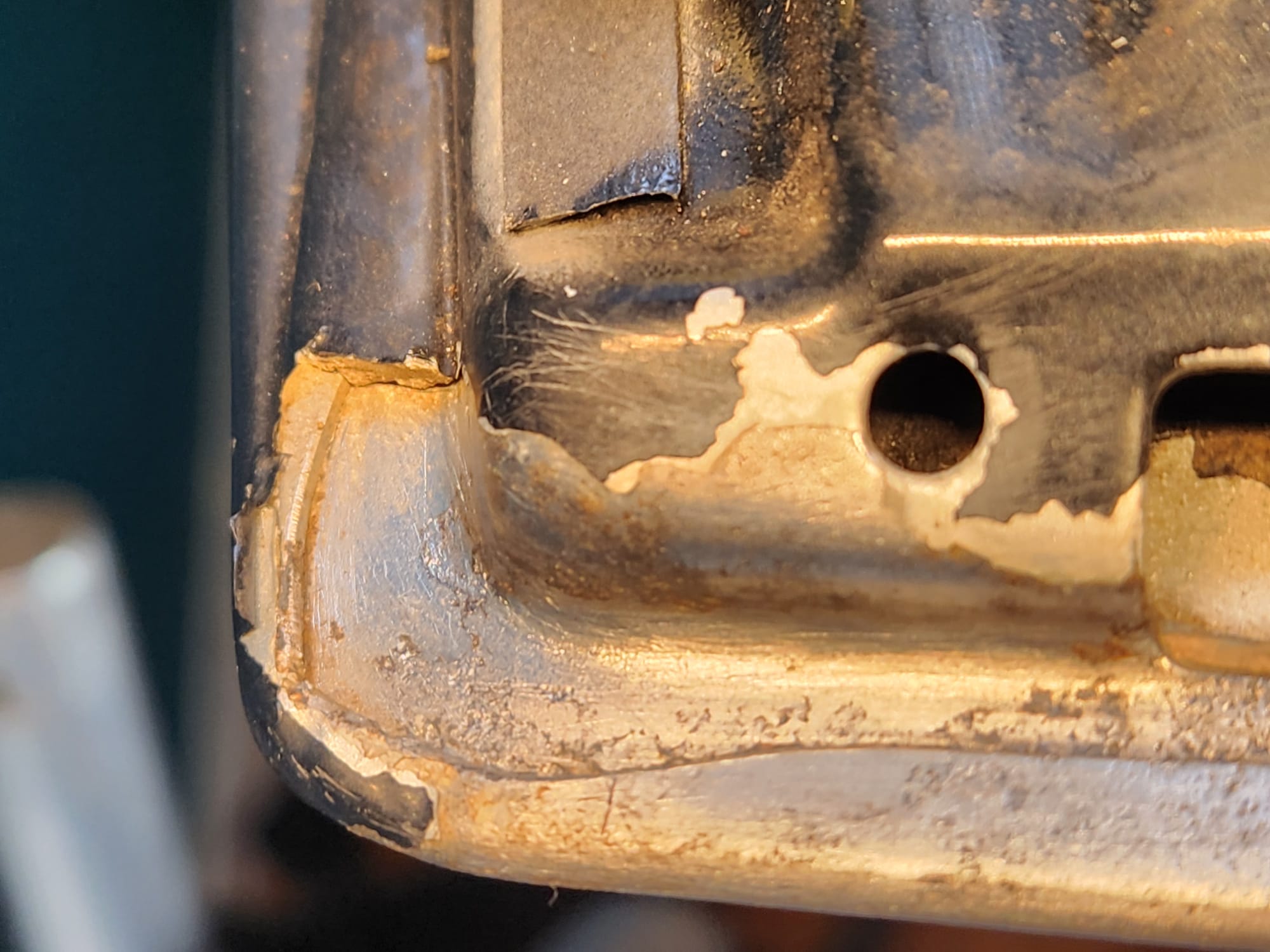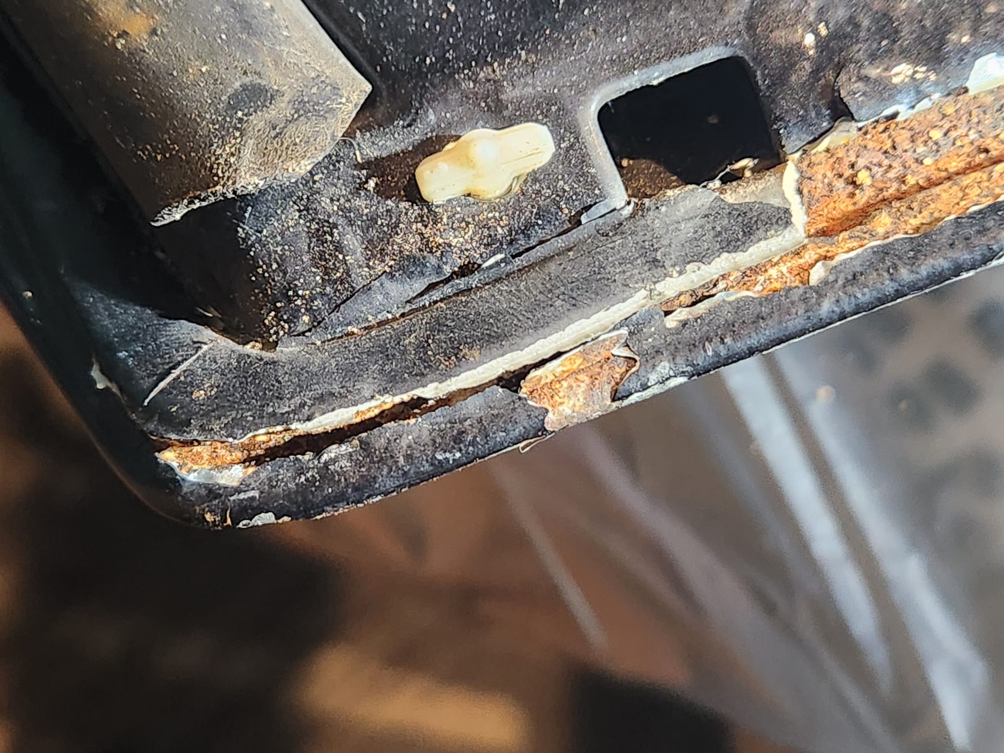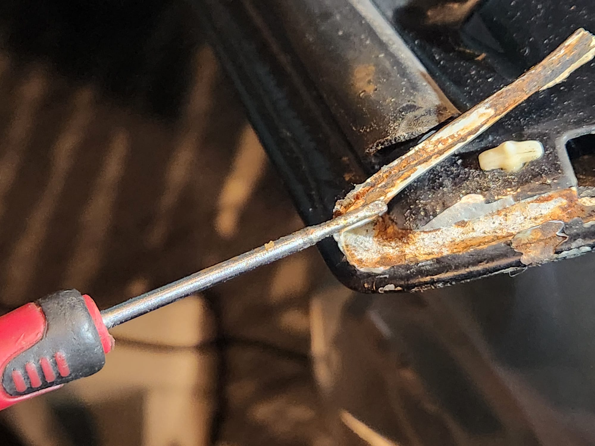 - Inspect for Damage: Examined the interior and exterior lower edge, identifying paint bubbling. Used a sharp small flat-head screwdriver and metal wire brush to aggressively scrape off the affected areas.