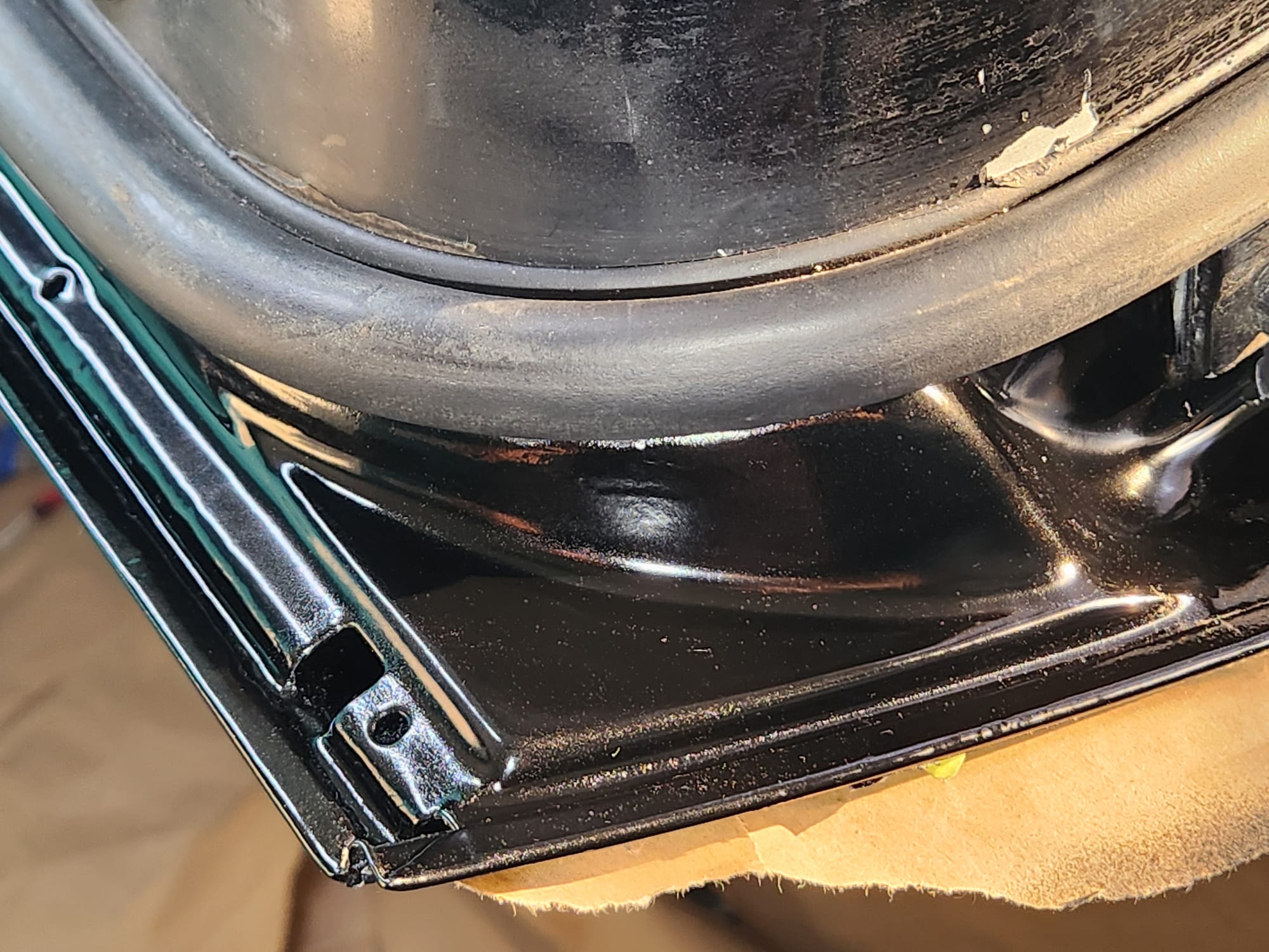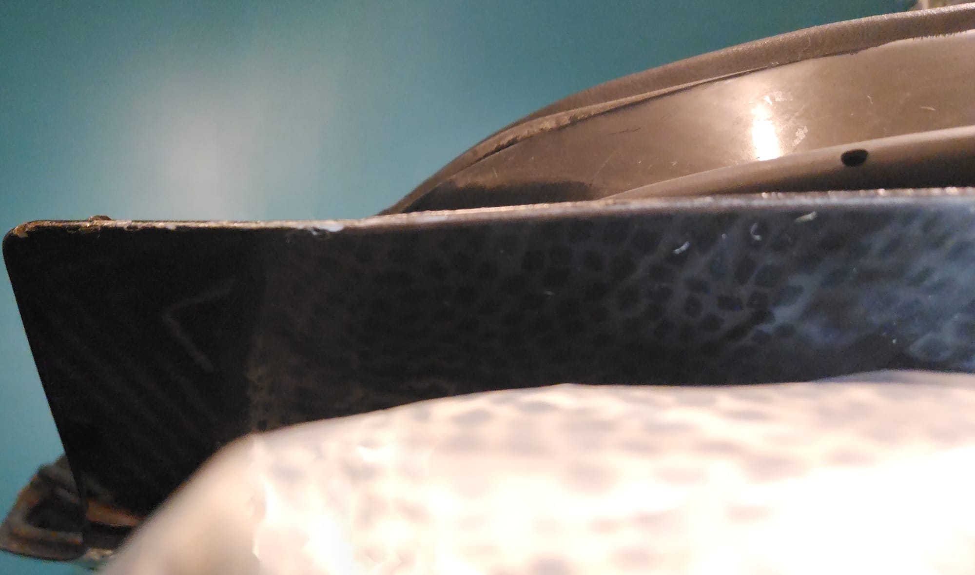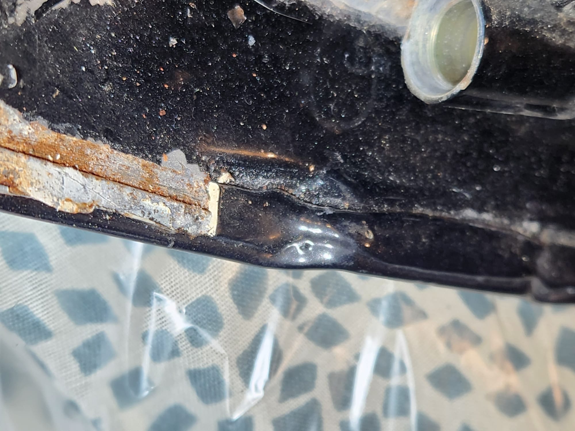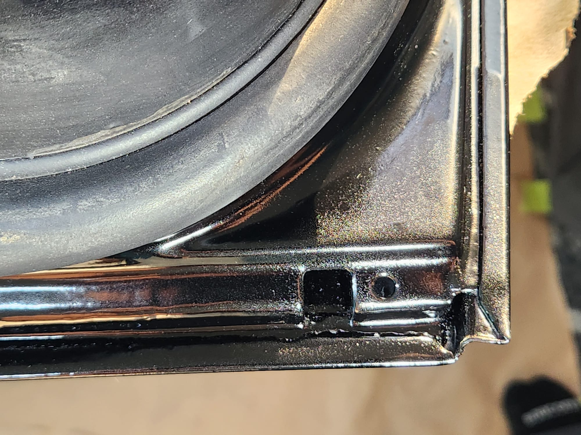 - Inspect for Damage: Examined the interior and exterior lower edge, identifying paint bubbling. Used a sharp small flat-head screwdriver and metal wire brush to aggressively scrape off the affected areas.