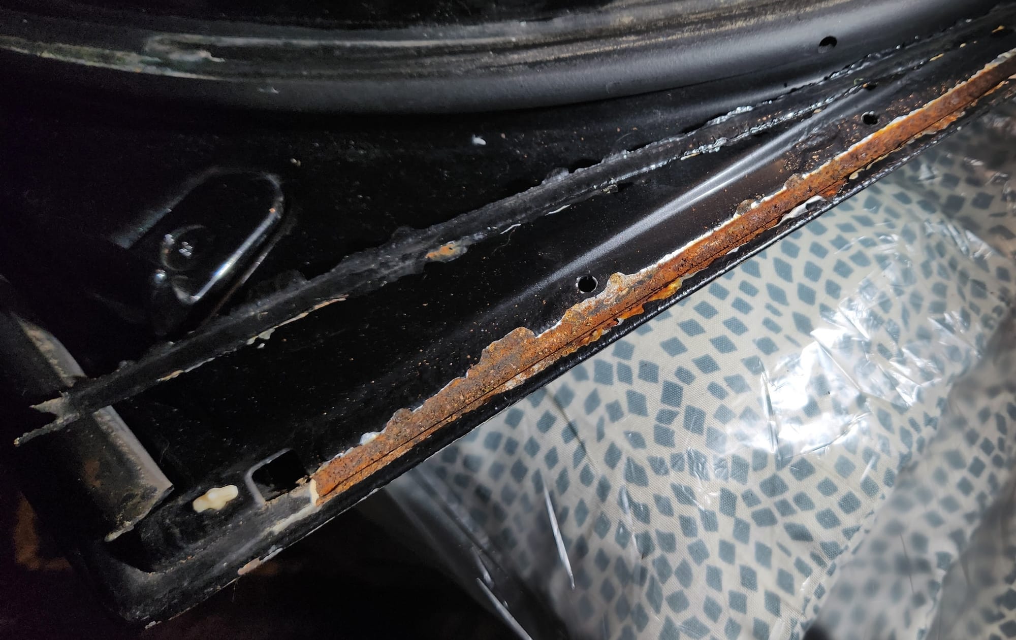 My remaining concern: And what about the space inside the door, between the outer and inner parts? Could rust start growing from the inside? Yes, it can. I researched a bit more. If I did all this fixing, would rust just come back from the inside? I found out that rust usually starts where the paint gets damaged, usually when rock or something hits or chips it.