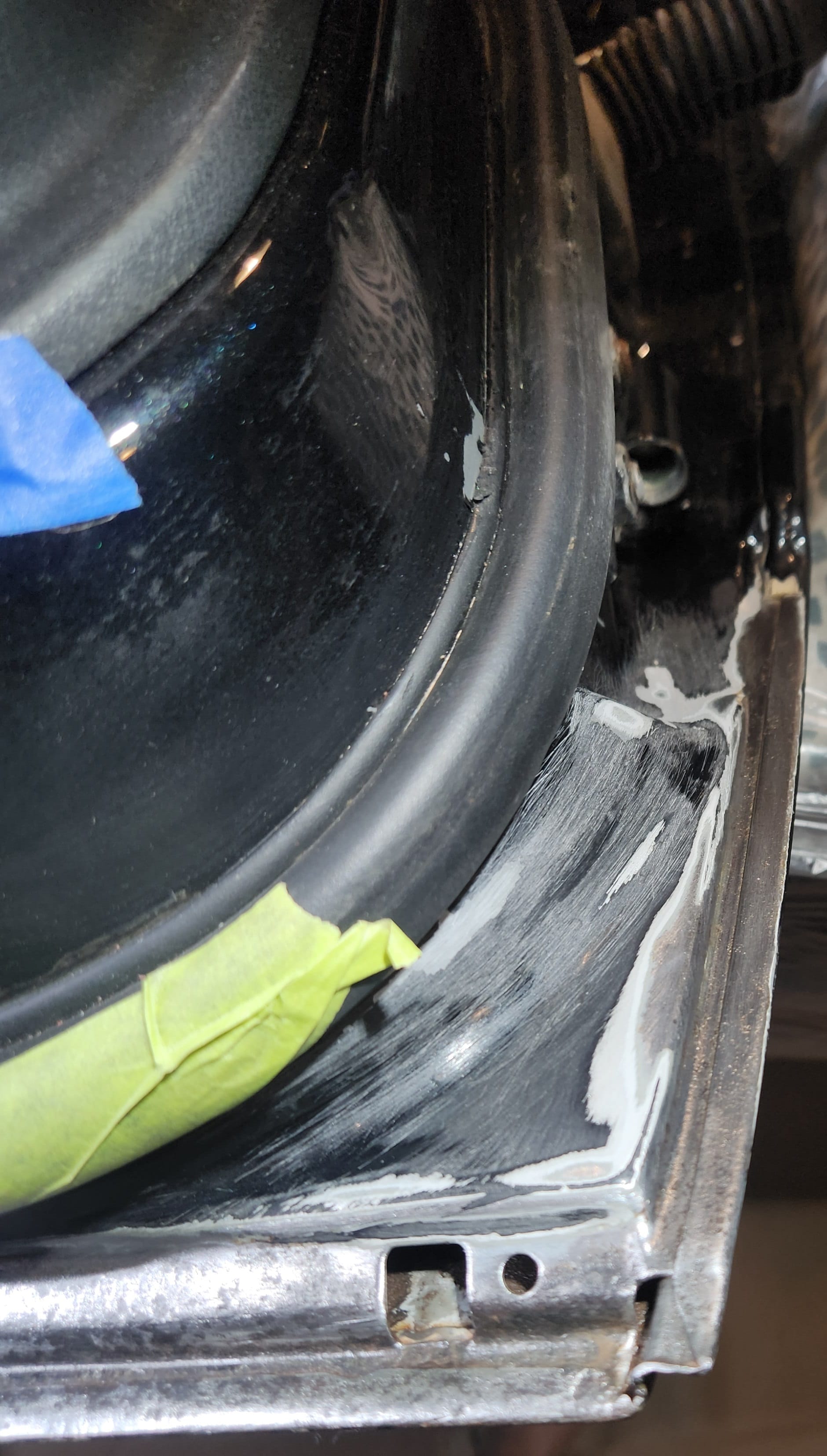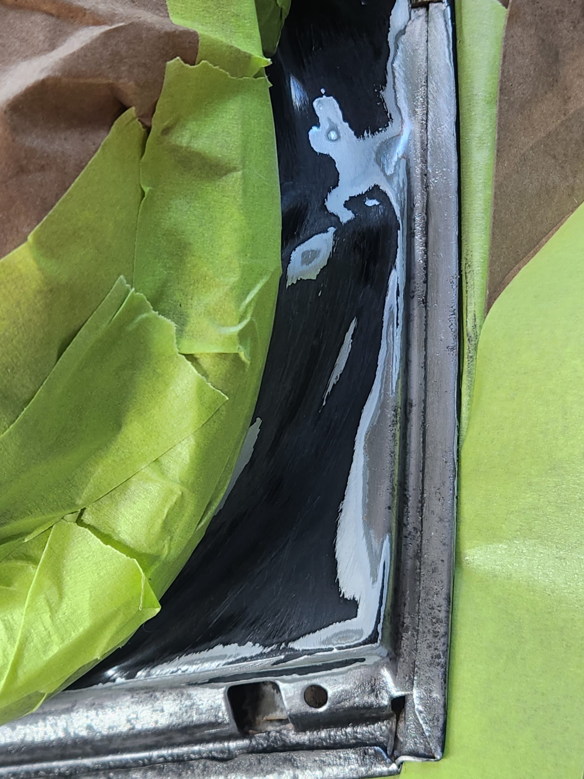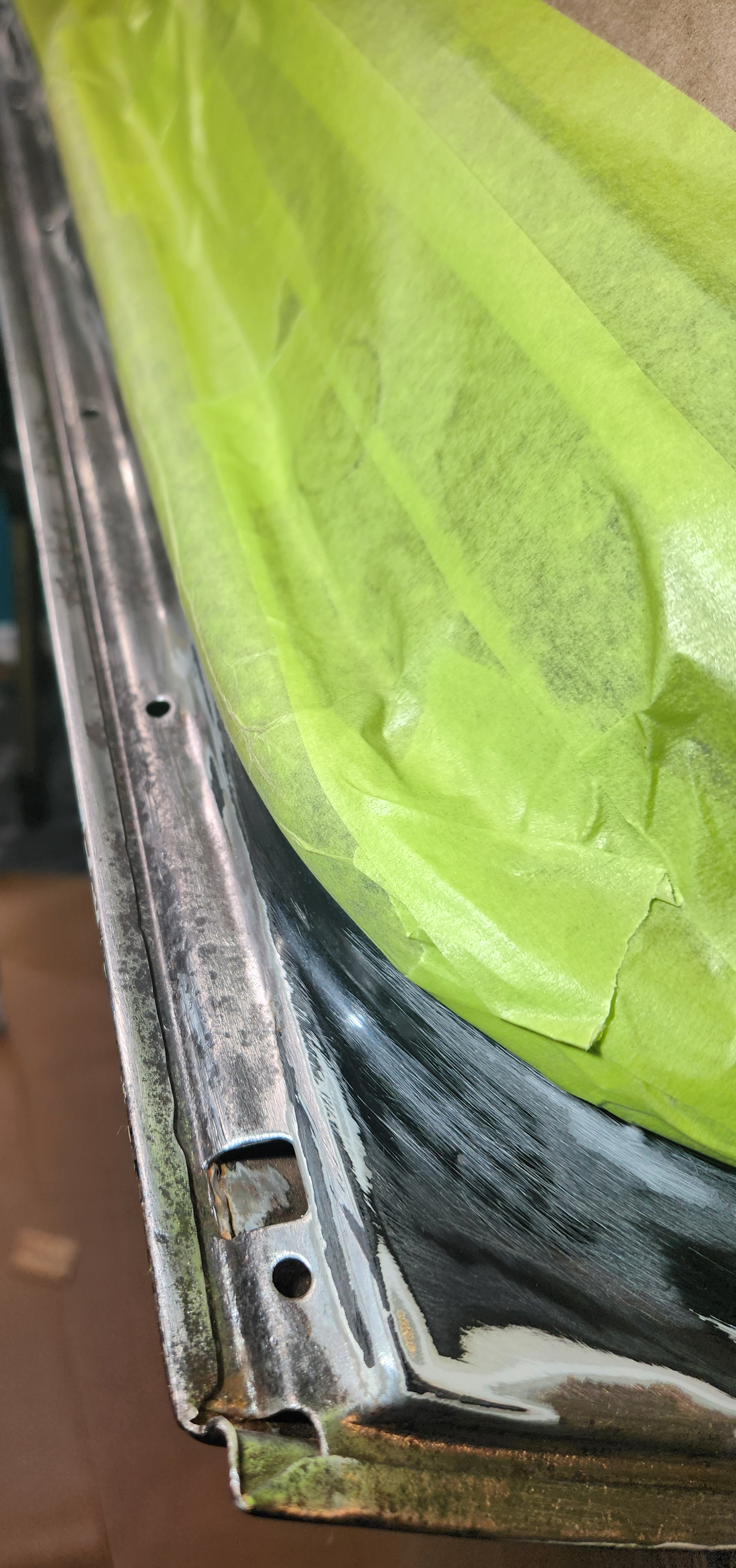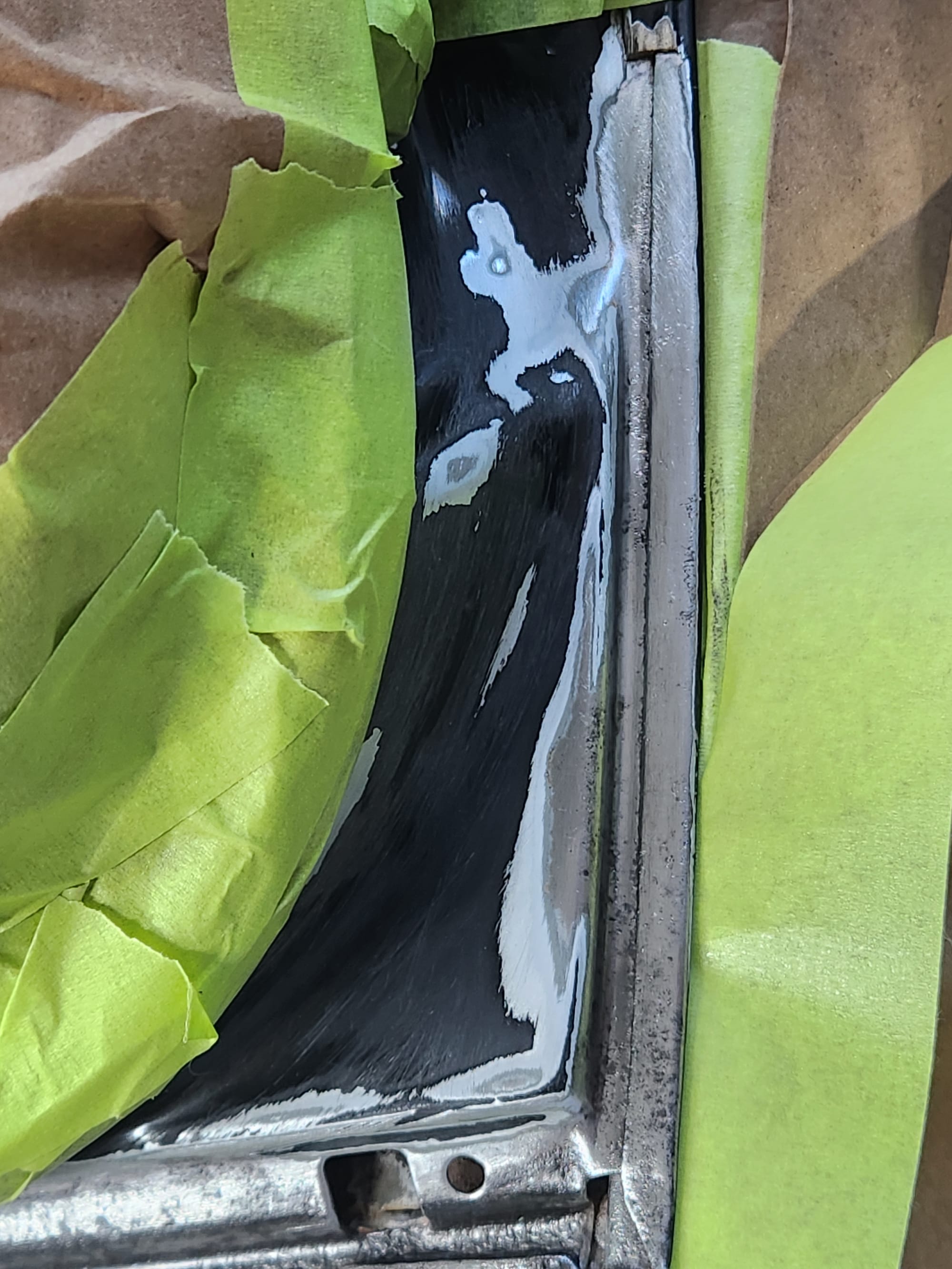 - Rust Treatment and Painting: After prepping both sides, applied rust converting jelly, then cleaned with rubbing alcohol. Covered the outer-facing edge with Tremclad flat black rust-inhibiting paint for temporary protection until a professional touch up could be done. For the interior-facing edge, primed and painted with Duplicolor primer and gloss black paint for immediate finish, choosing these products for local availability.