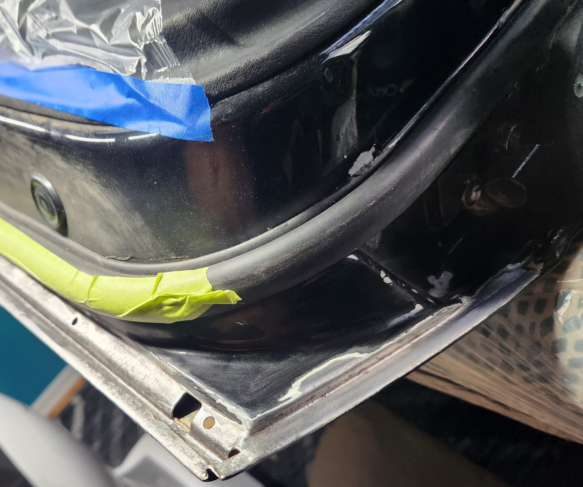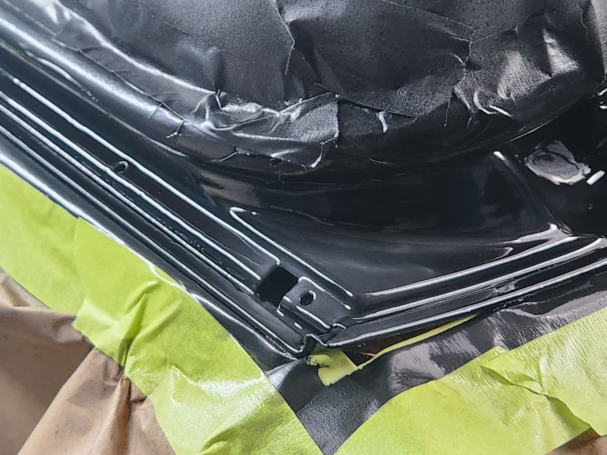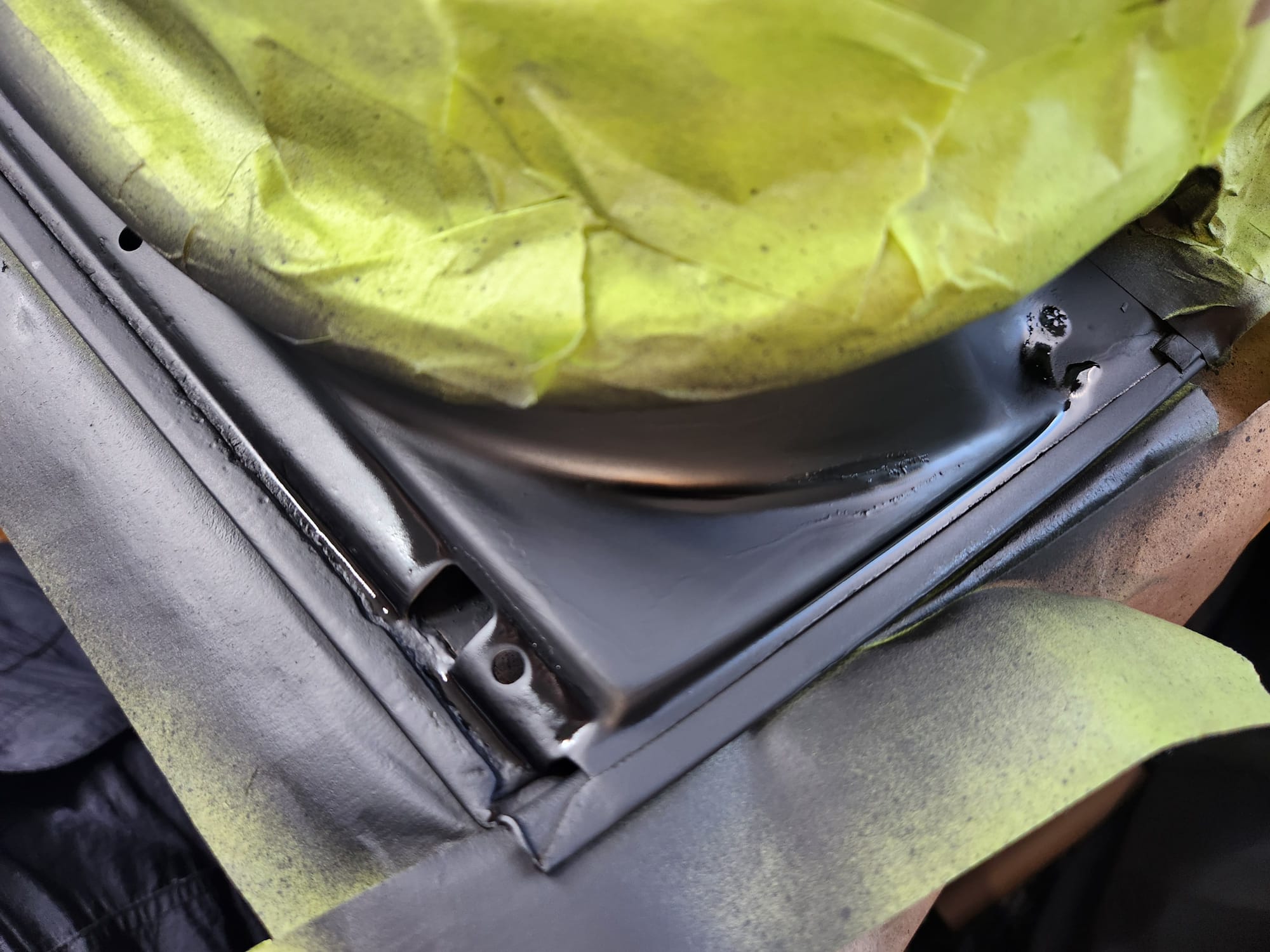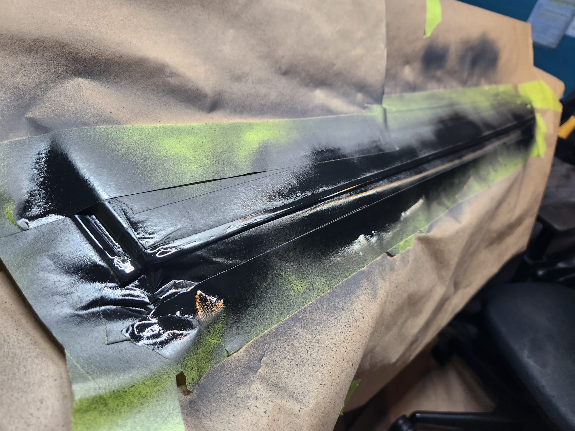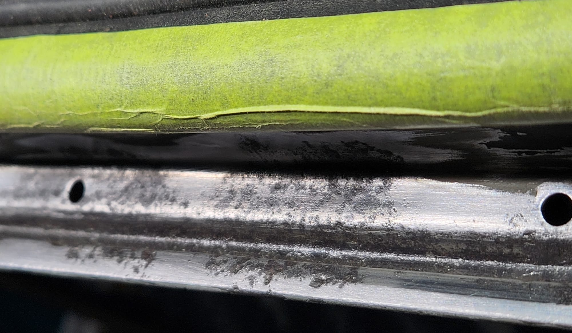 - Rust Treatment and Painting: After prepping both sides, applied rust converting jelly, then cleaned with rubbing alcohol. Covered the outer-facing edge with Tremclad flat black rust-inhibiting paint for temporary protection until a professional touch up could be done. For the interior-facing edge, primed and painted with Duplicolor primer and gloss black paint for immediate finish, choosing these products for local availability.