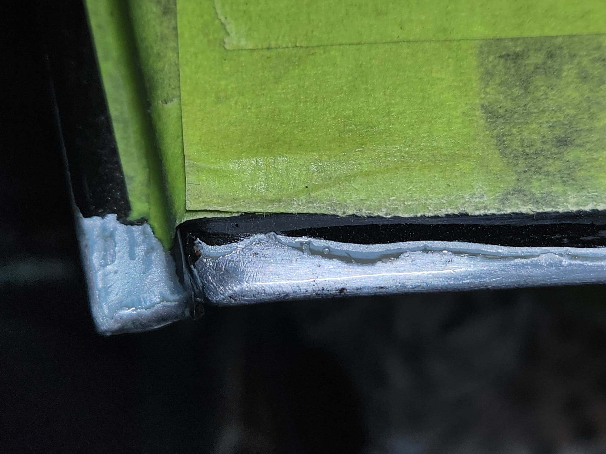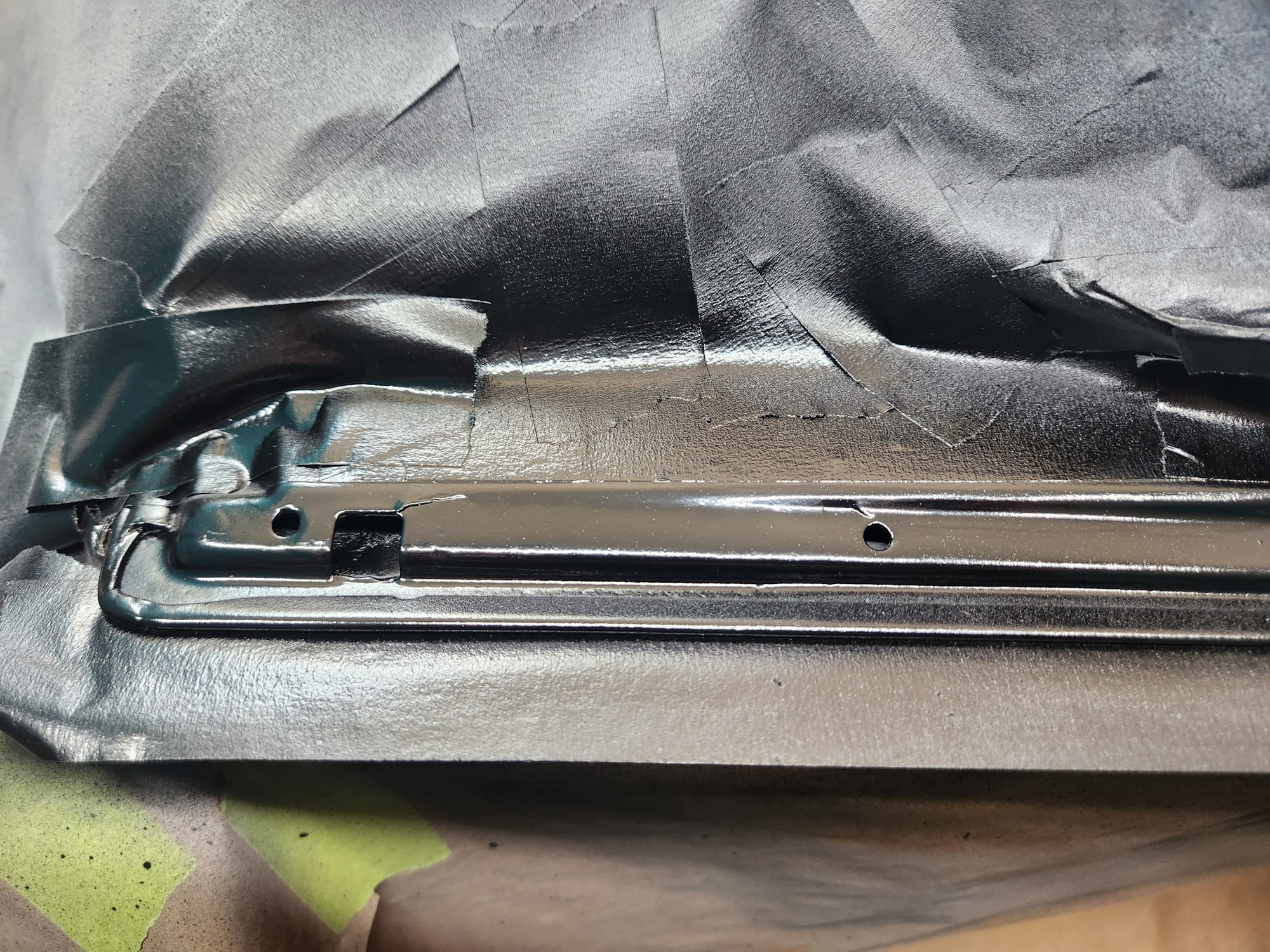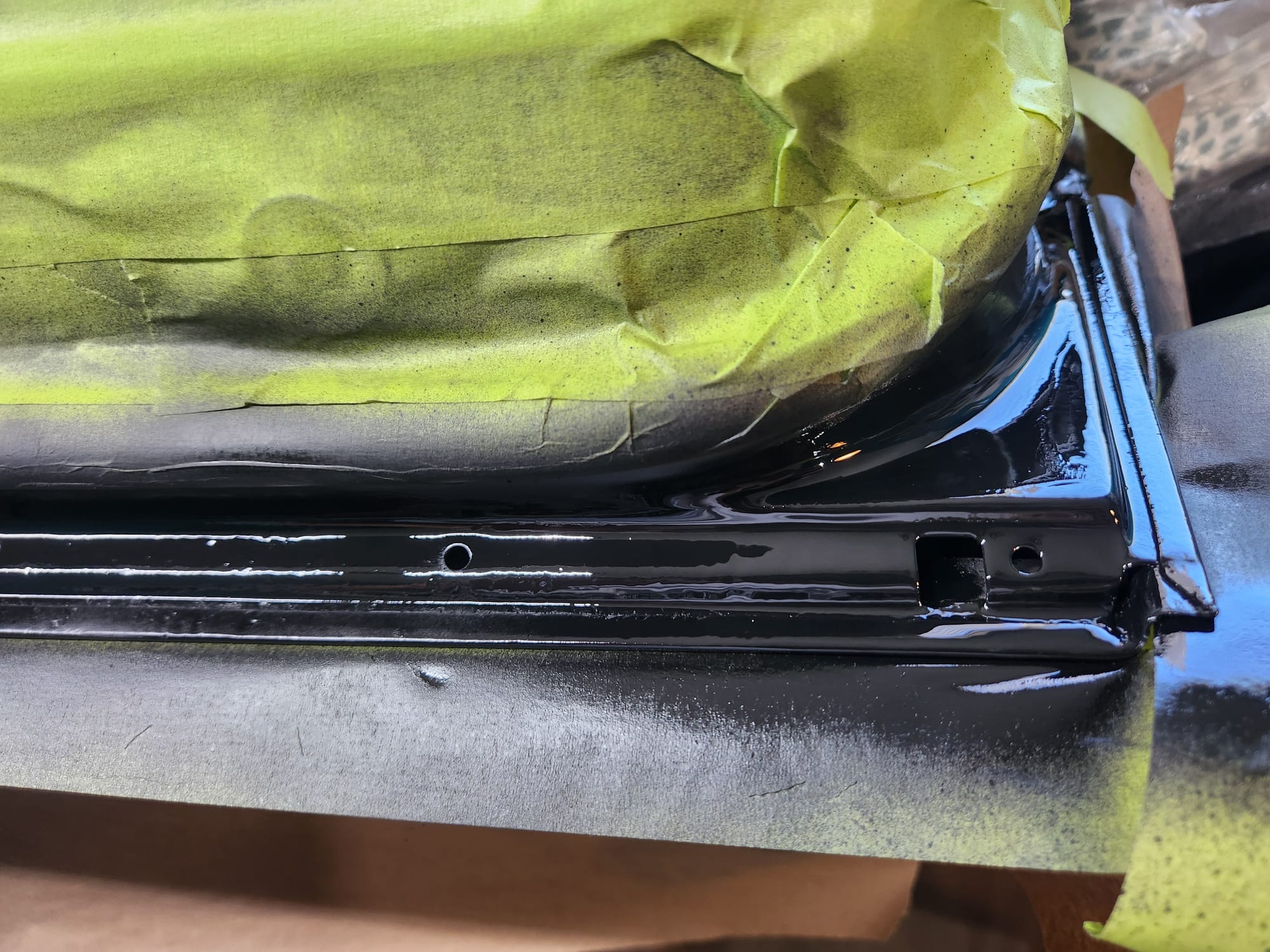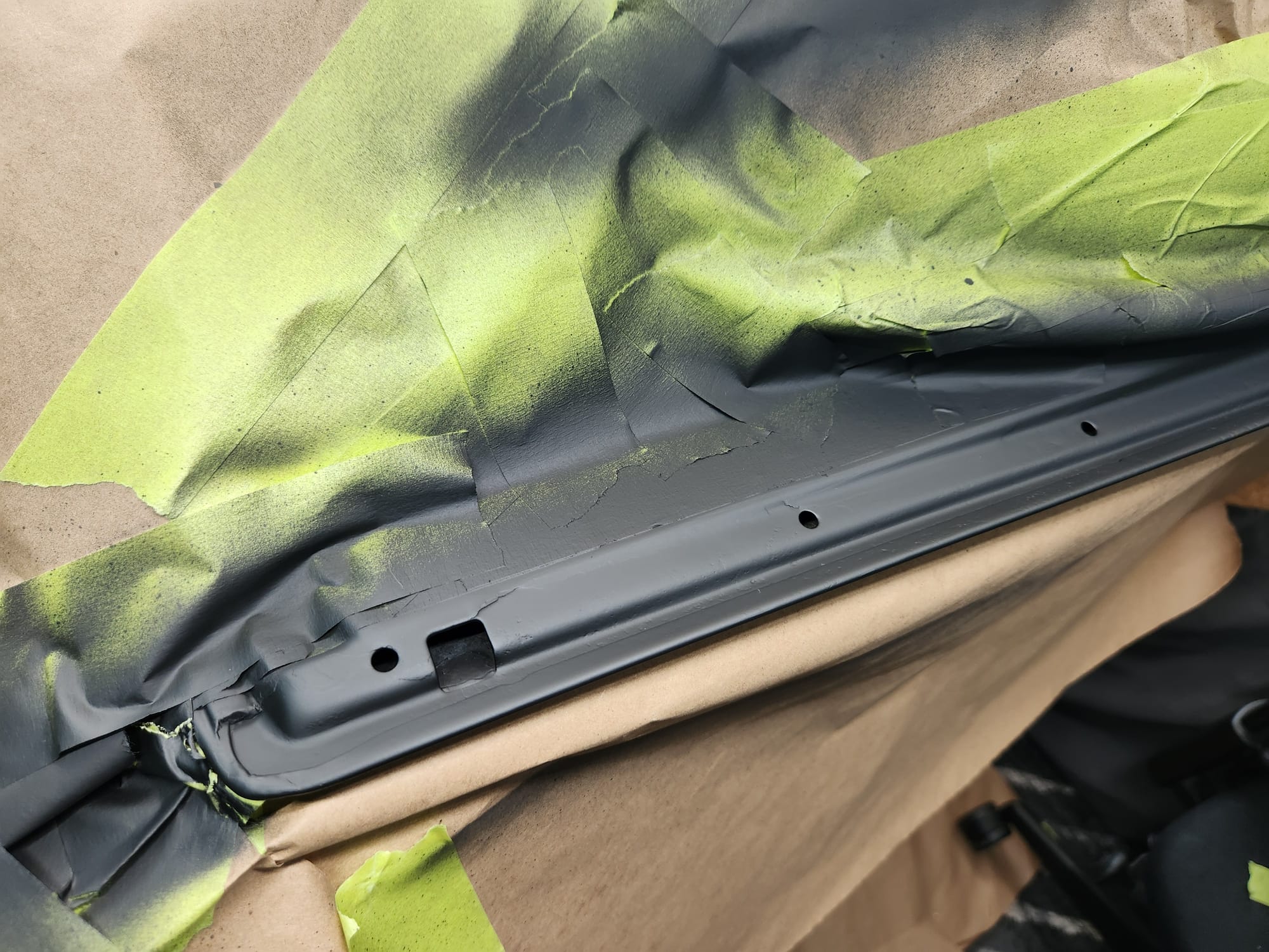 - Rust Treatment and Painting: After prepping both sides, applied rust converting jelly, then cleaned with rubbing alcohol. Covered the outer-facing edge with Tremclad flat black rust-inhibiting paint for temporary protection until a professional touch up could be done. For the interior-facing edge, primed and painted with Duplicolor primer and gloss black paint for immediate finish, choosing these products for local availability.