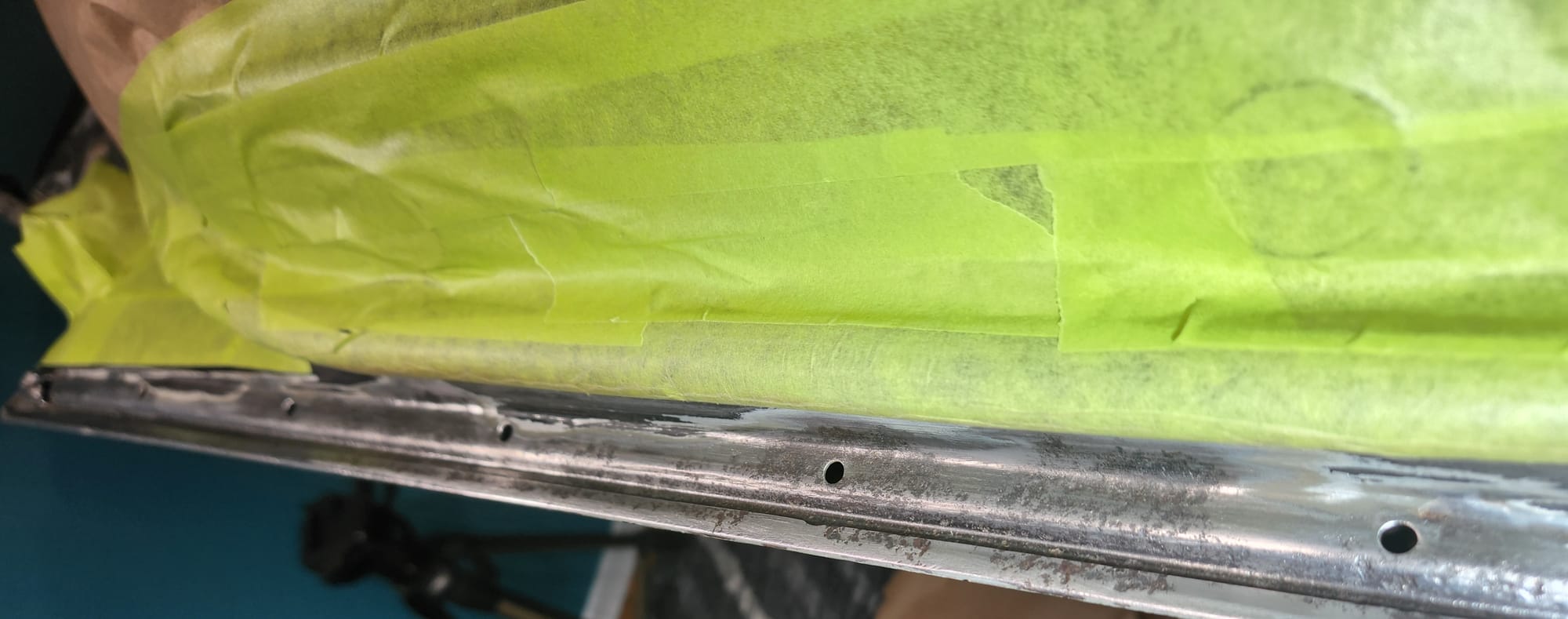 - Outward Edge Inspection: Flipped the door to inspect the outward-facing edge. Noticed minor rust bubbling beginning to spread. Masked off the lower edge with painter's tape just above the rust bubbles. Initially used a flat-head screwdriver and metal wire brush, followed by 320 grit sandpaper. Opted for finer grit for the outward side to minimize unnecessary paint damage. For the inner edge, employed a flapper sanding disc attached to a drill for a quicker rust removal process.
