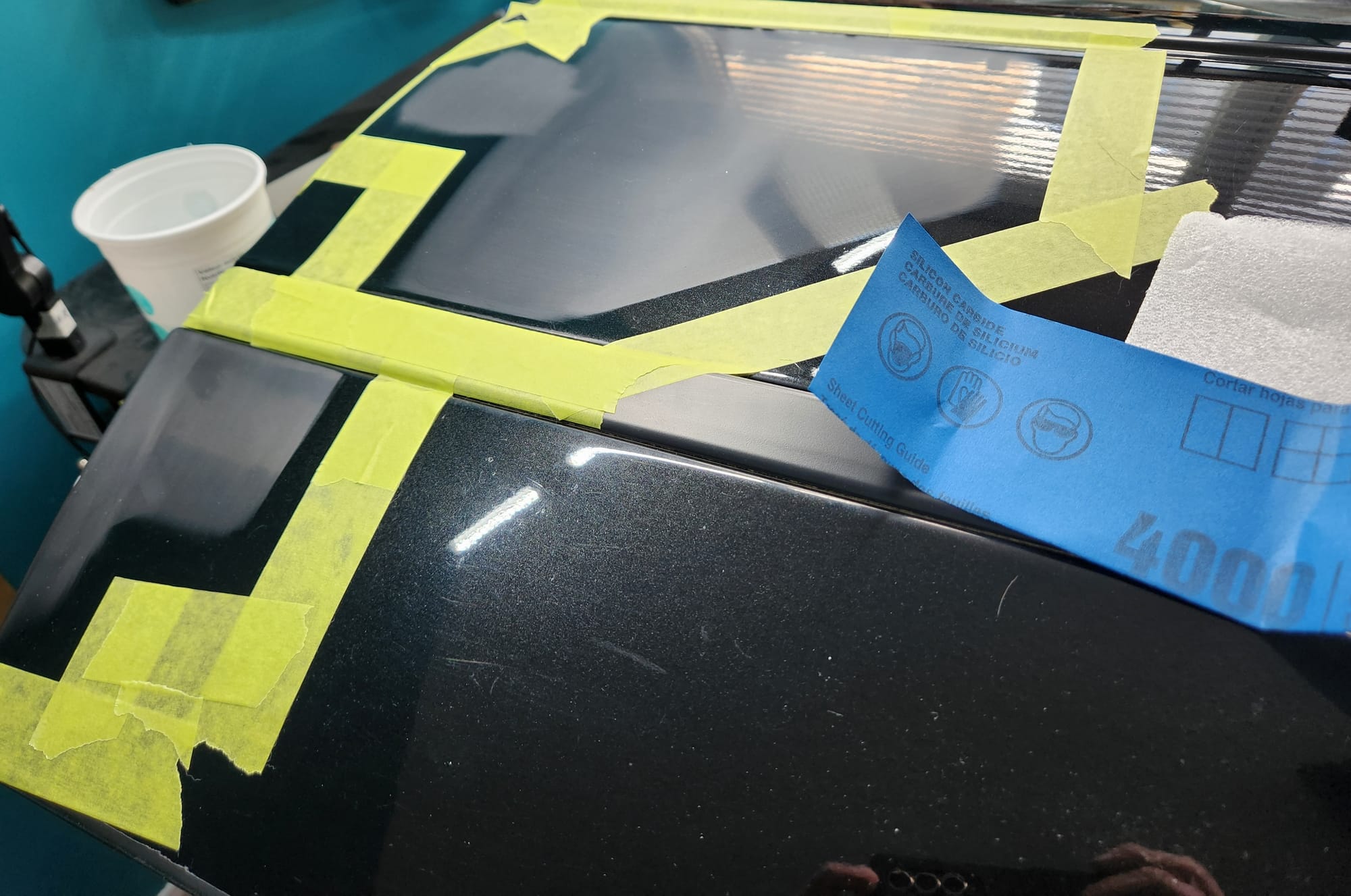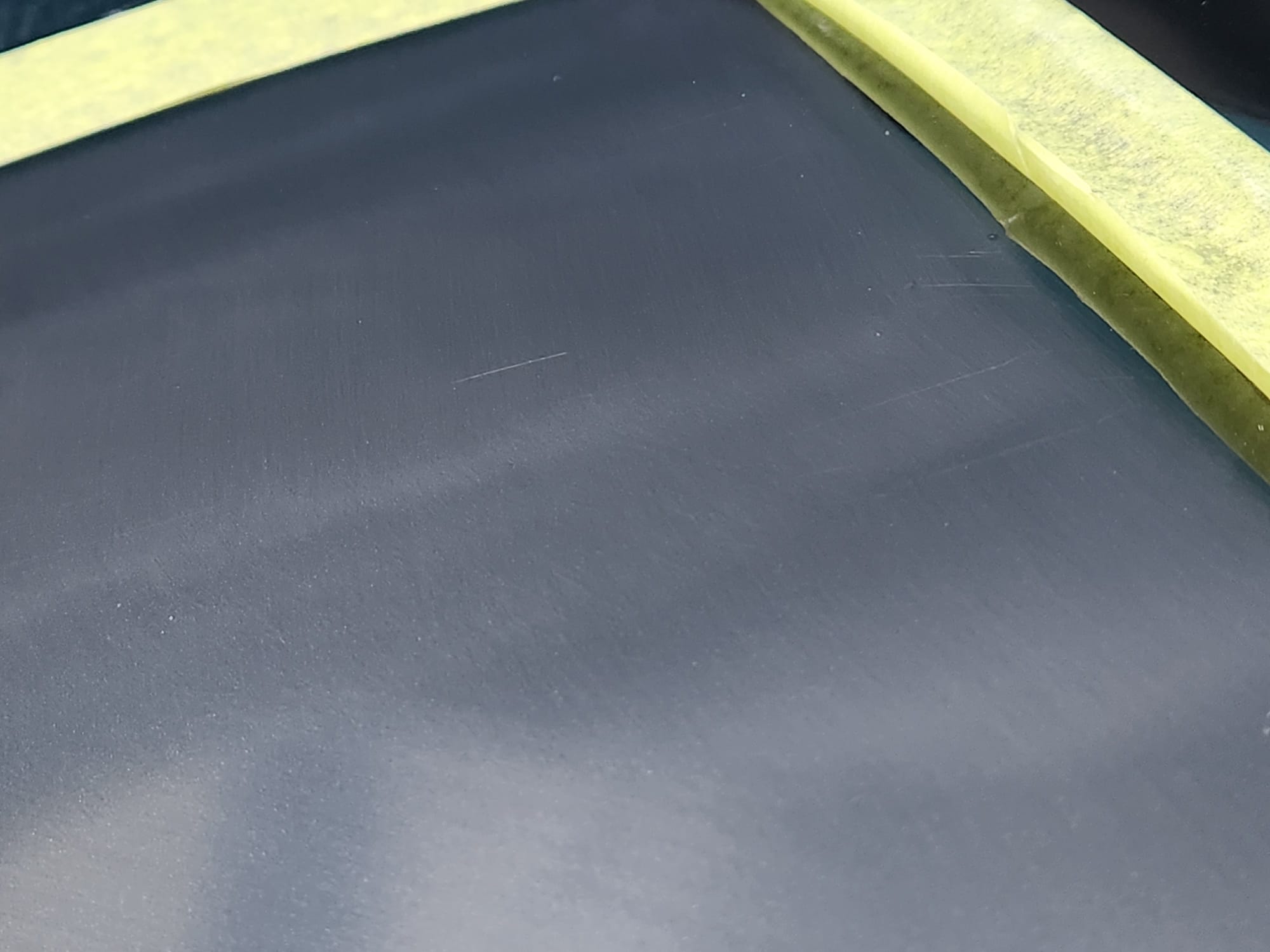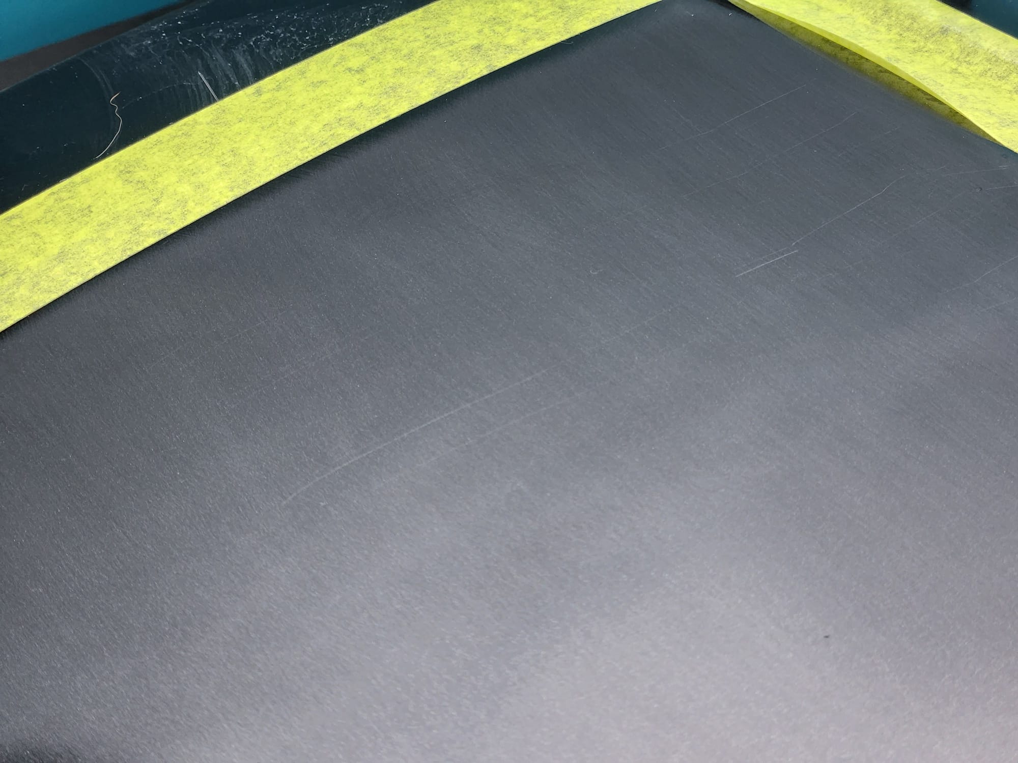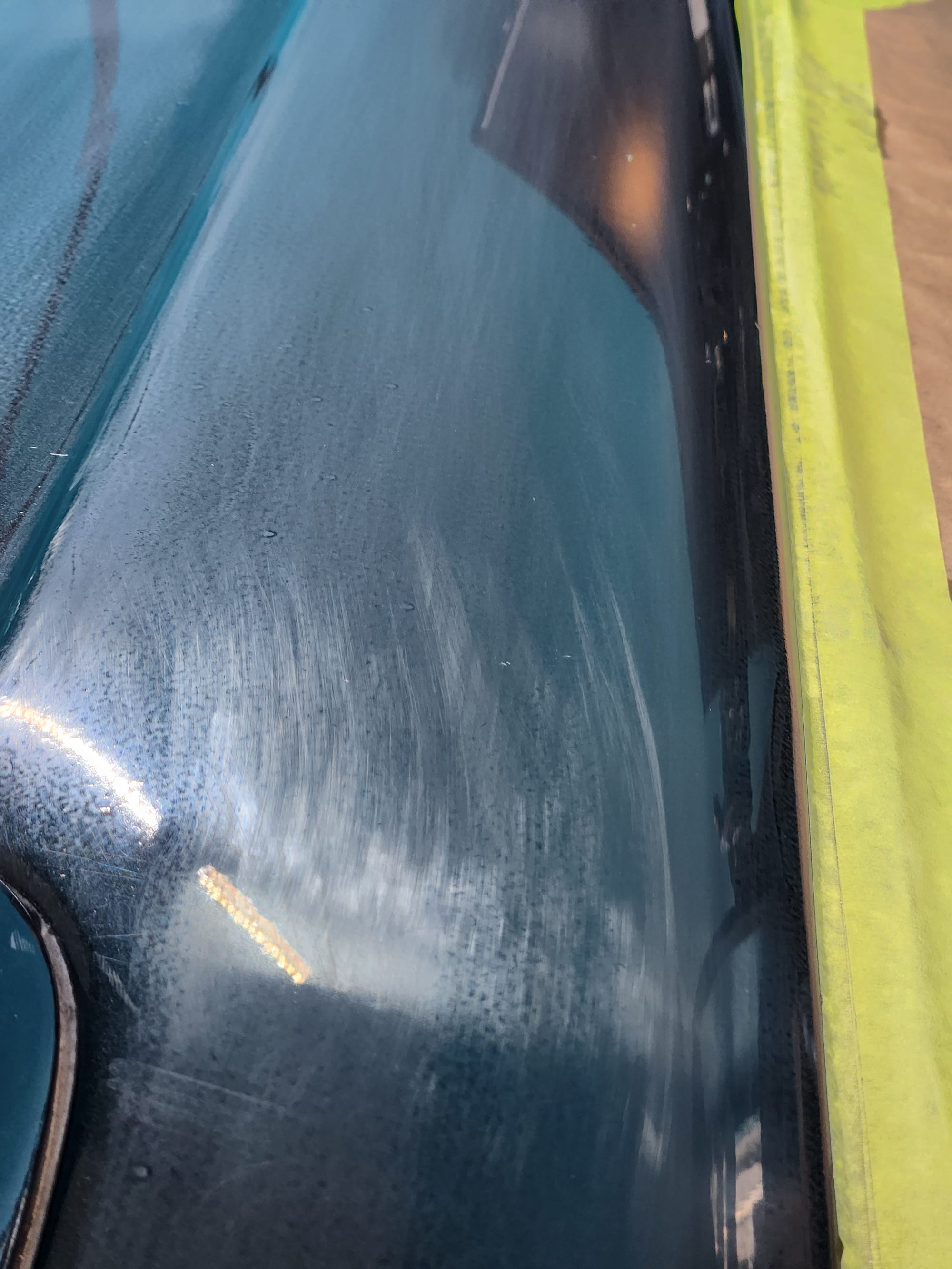 - Put tape around the major scratches and sanded with 3000 grit sandpaper. I tried to alternate between horizontal only and vertical only sets of sanding stages, checking if the previous stages marks were gone, allowing me to sand evenly. I was looking for a uniform haze which can later be polished out and the scratches would be gone.