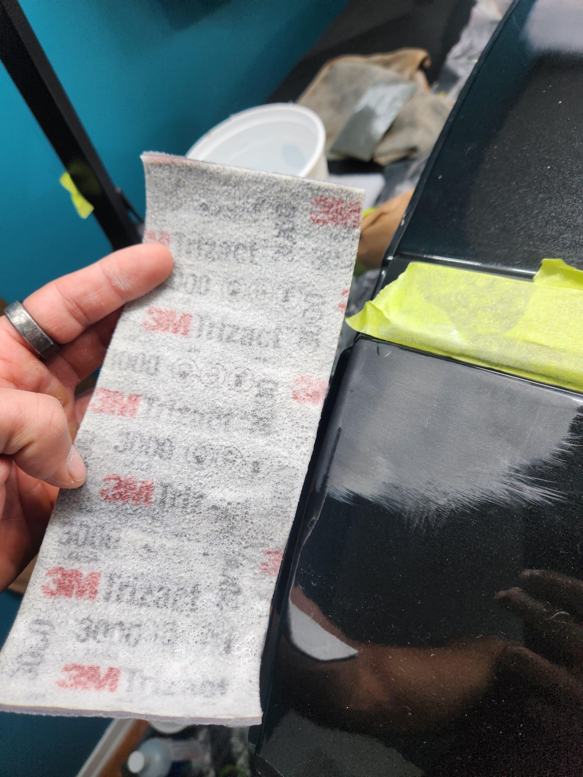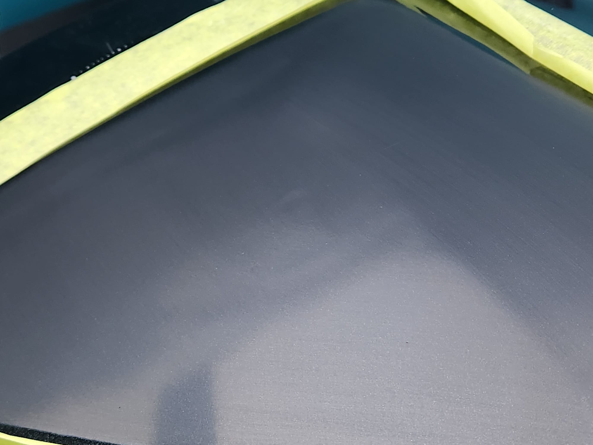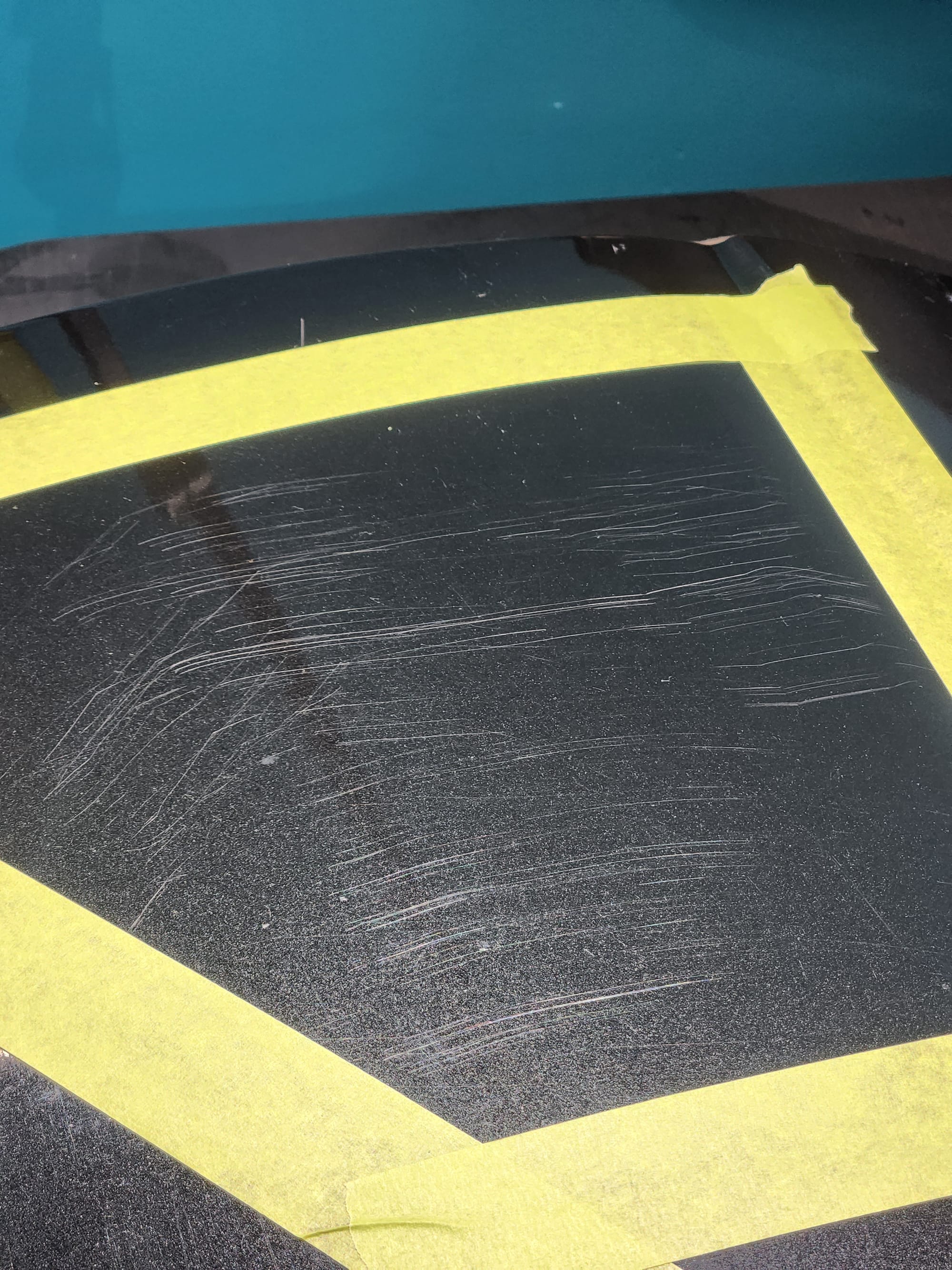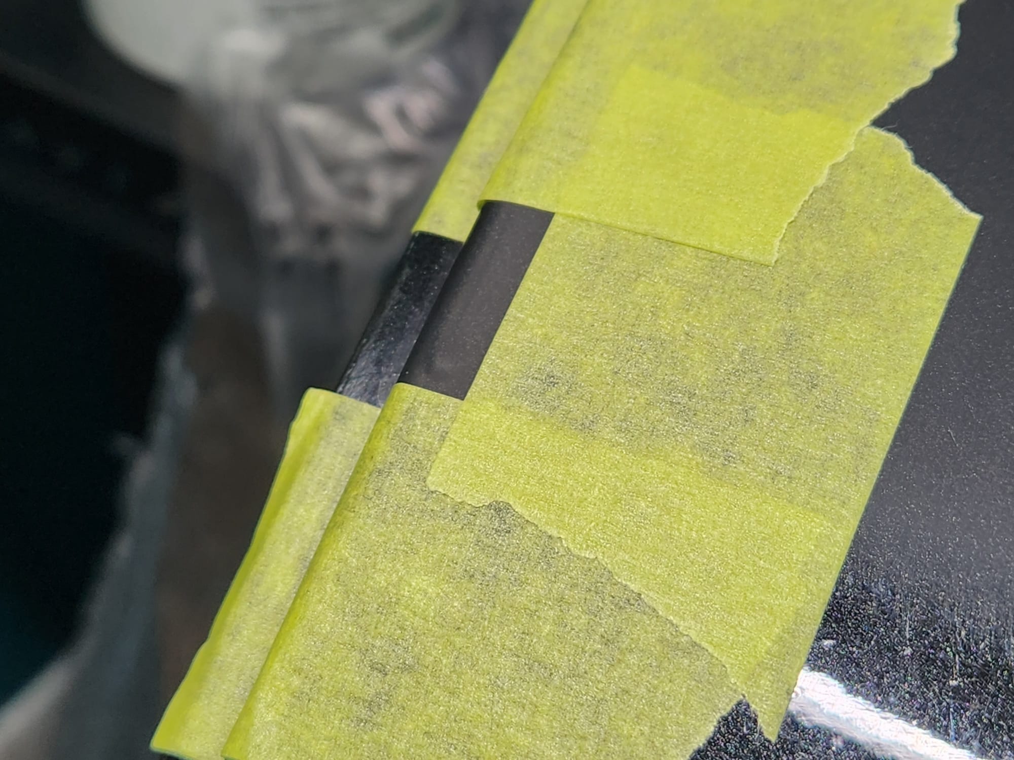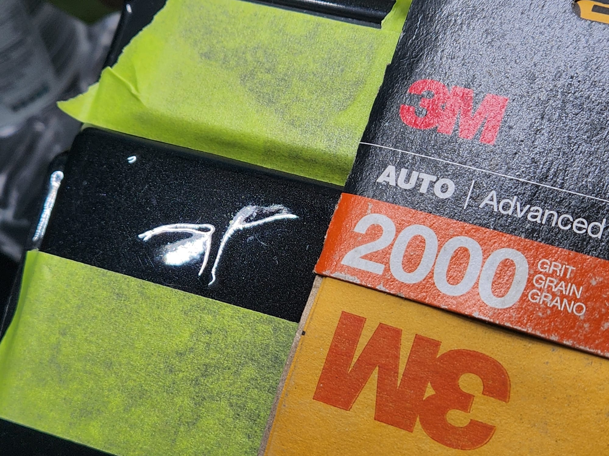 - Put tape around the major scratches and sanded with 3000 grit sandpaper. I tried to alternate between horizontal only and vertical only sets of sanding stages, checking if the previous stages marks were gone, allowing me to sand evenly. I was looking for a uniform haze which can later be polished out and the scratches would be gone.