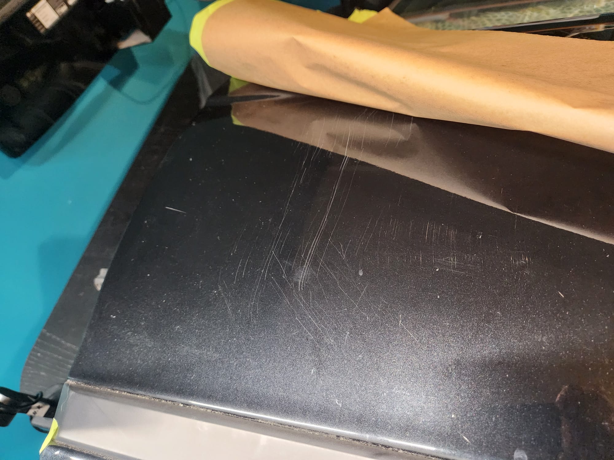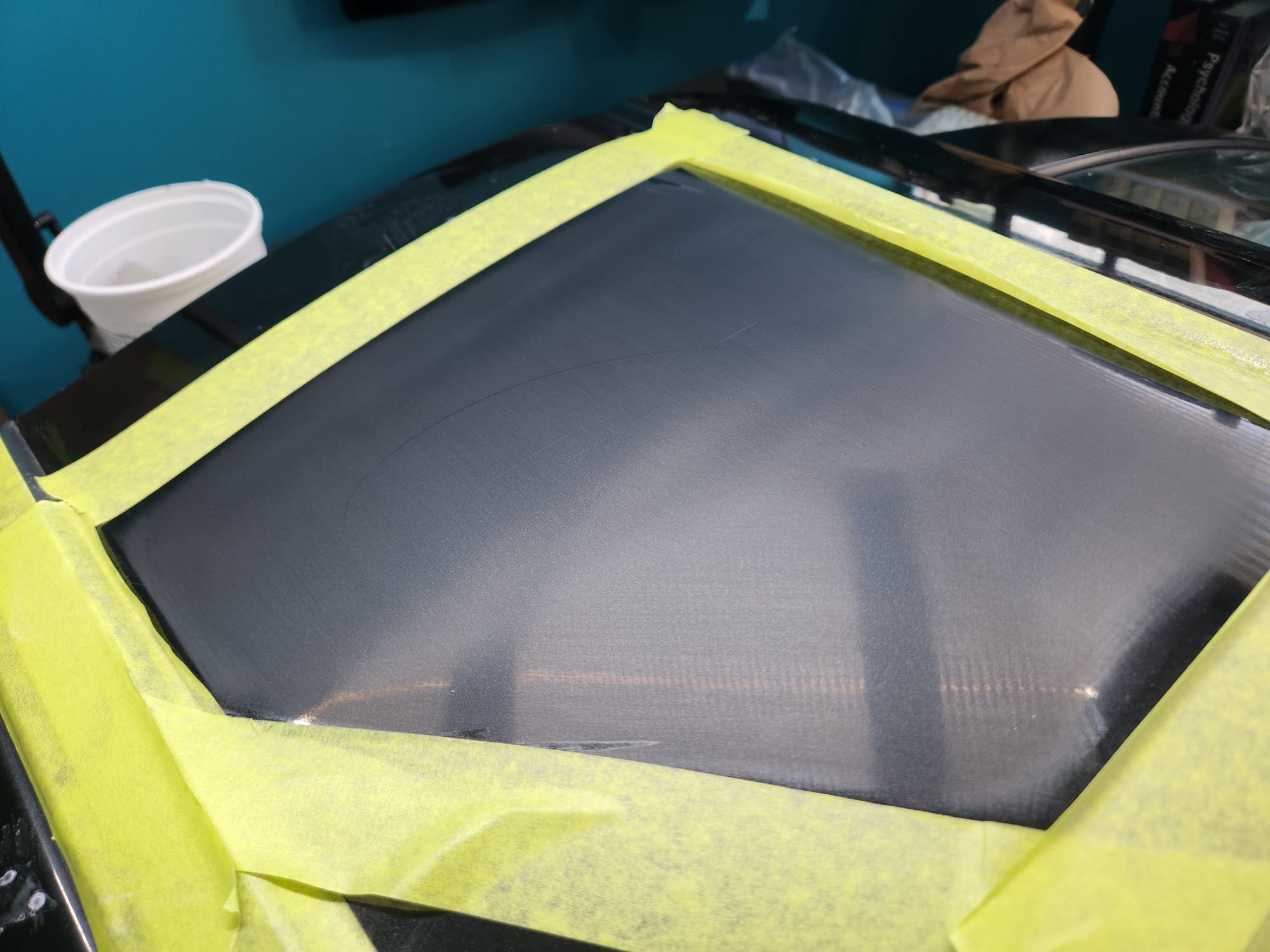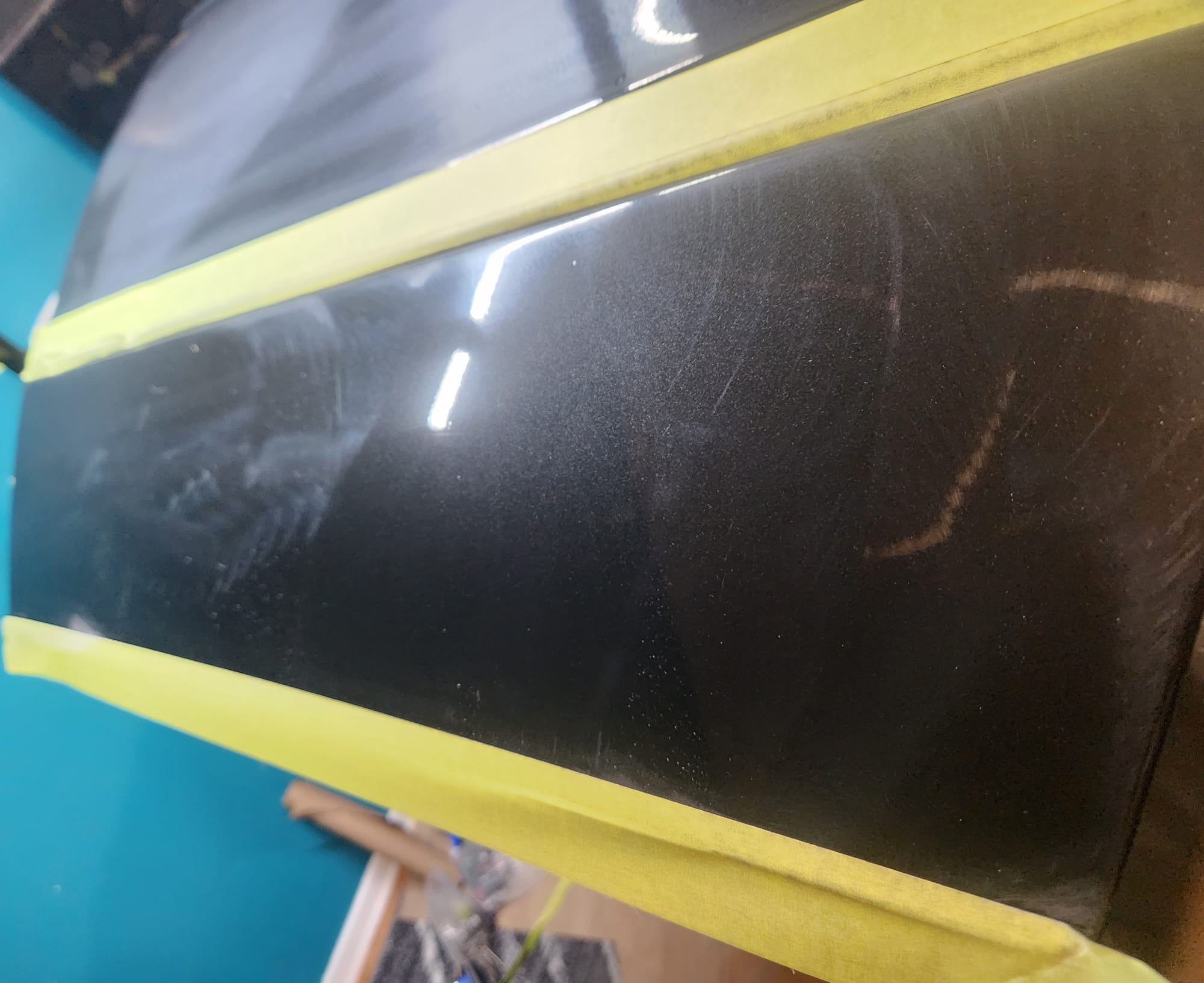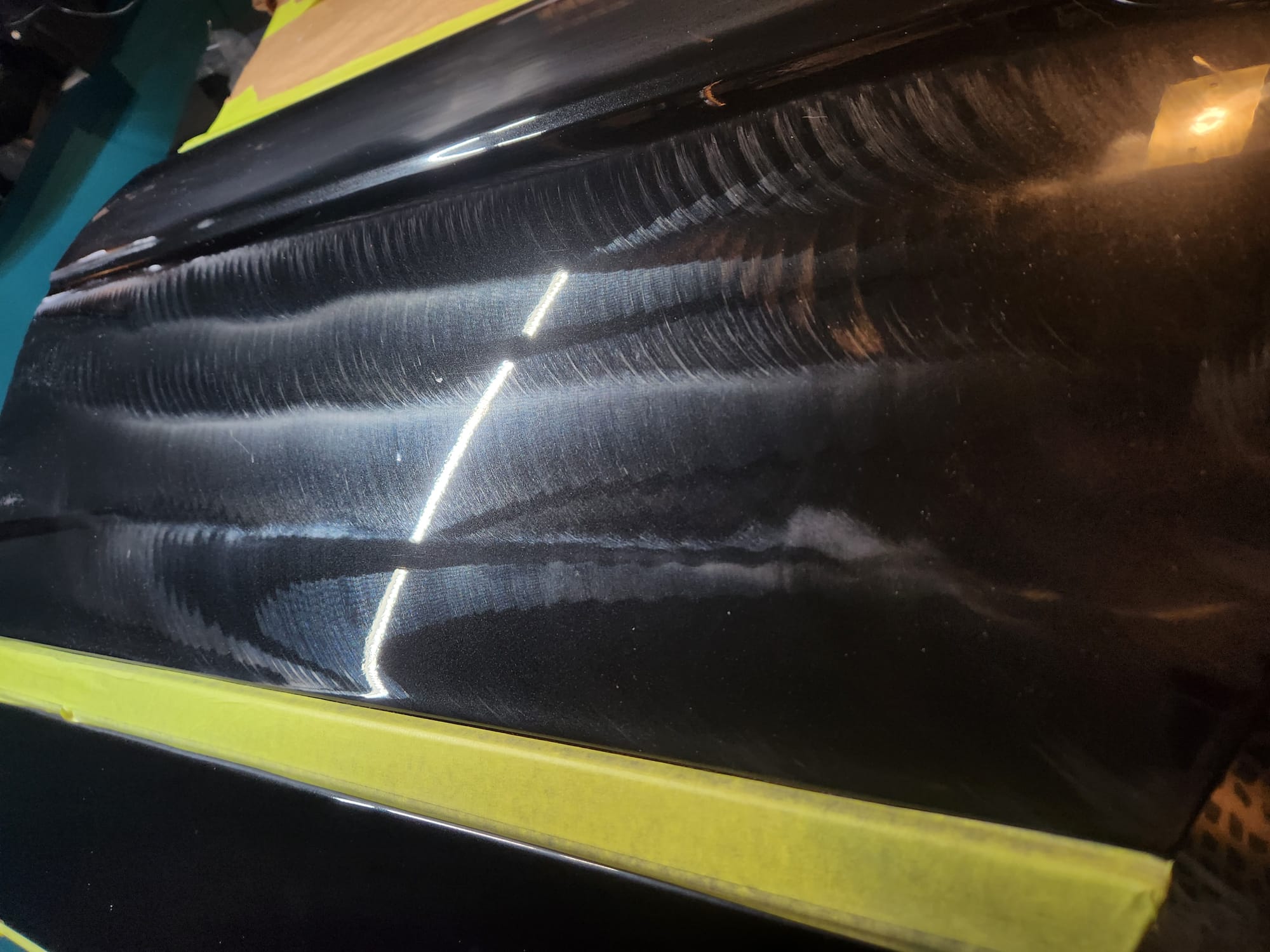 - Put tape around the major scratches and sanded with 3000 grit sandpaper. I tried to alternate between horizontal only and vertical only sets of sanding stages, checking if the previous stages marks were gone, allowing me to sand evenly. I was looking for a uniform haze which can later be polished out and the scratches would be gone.