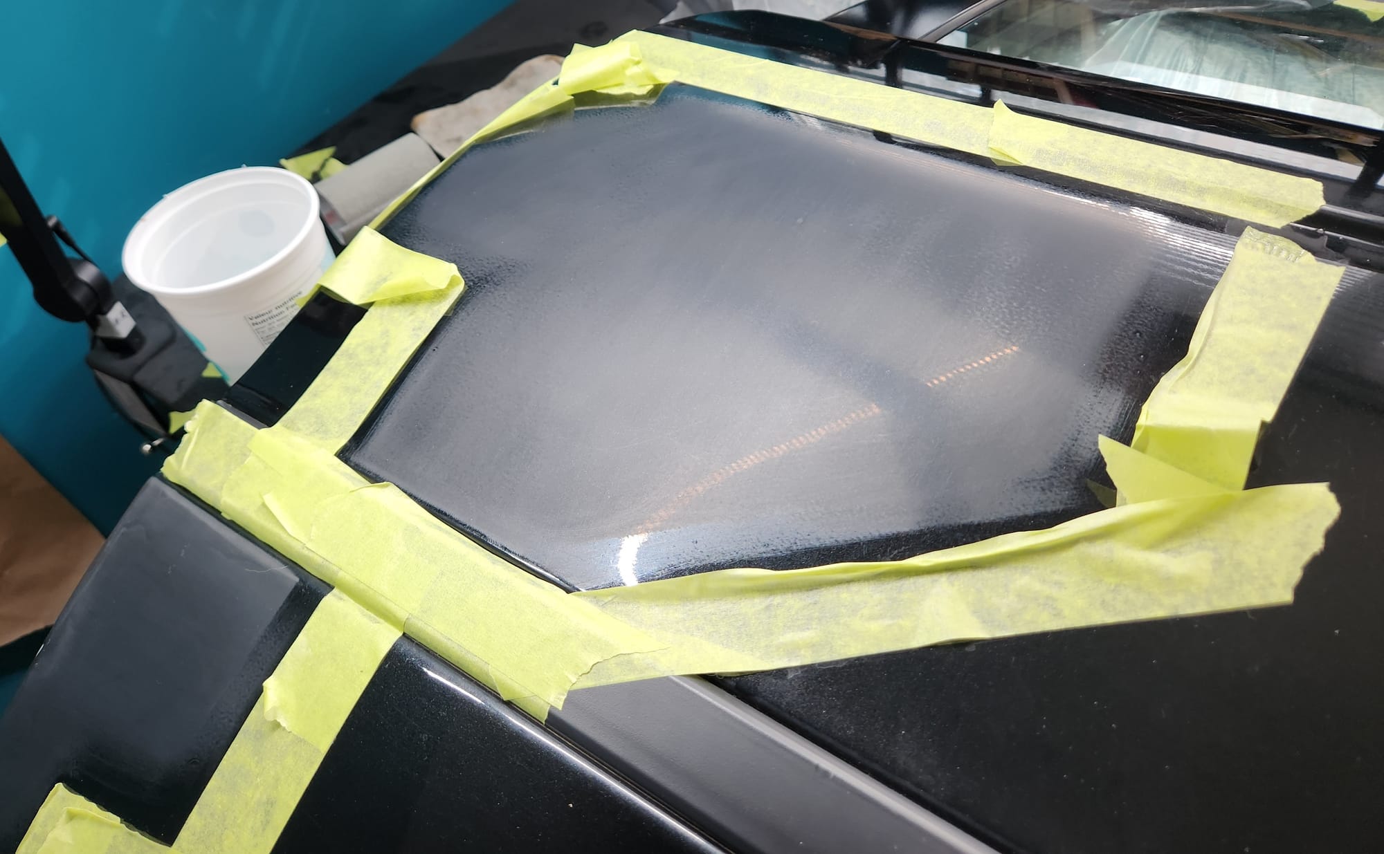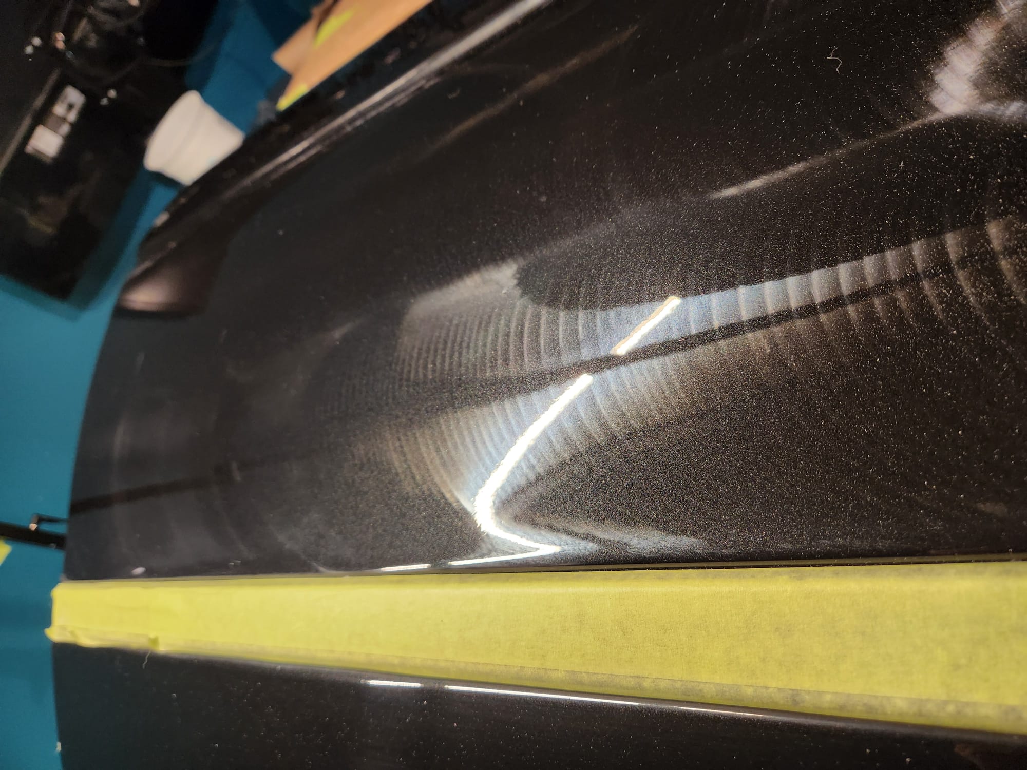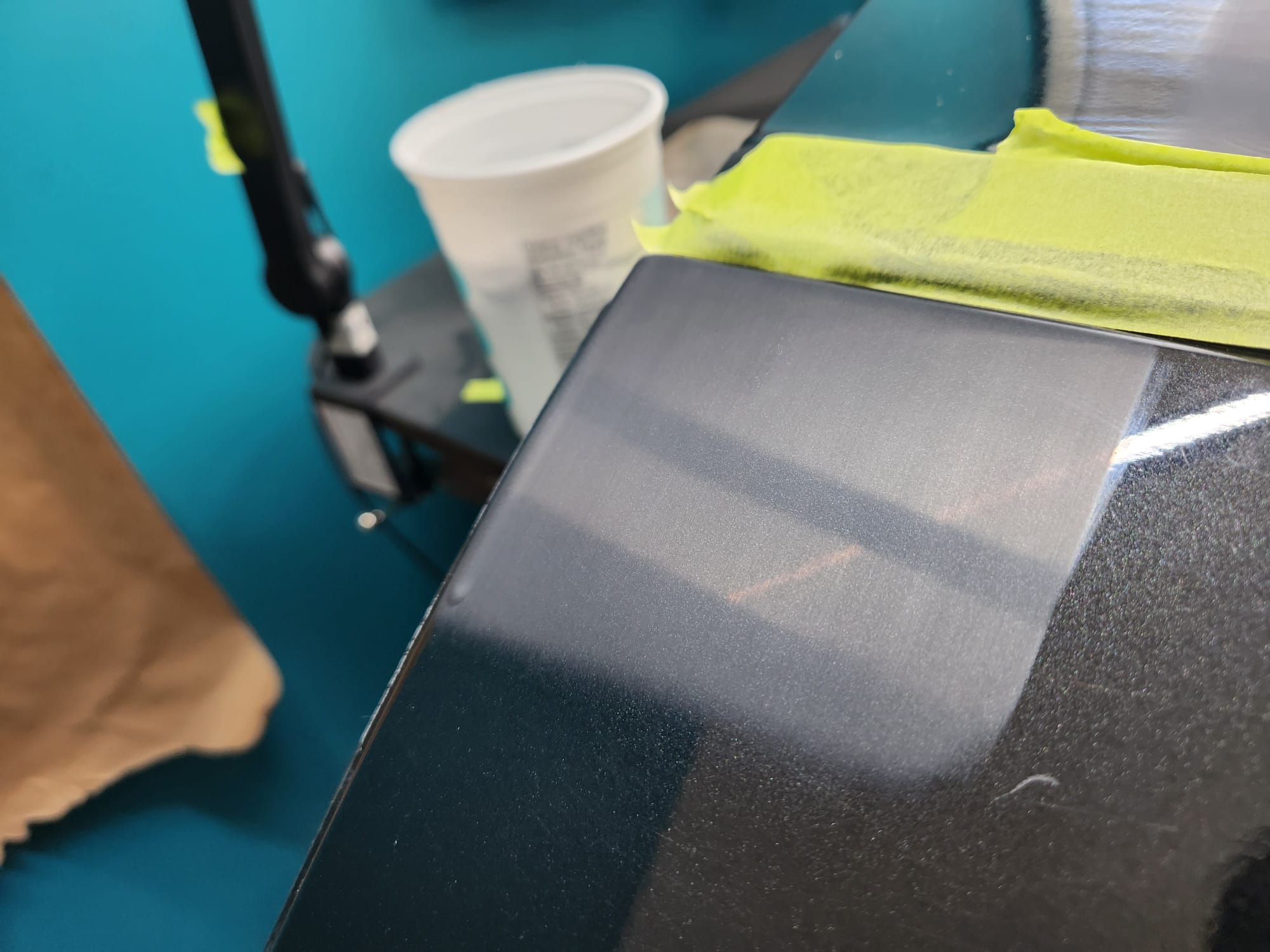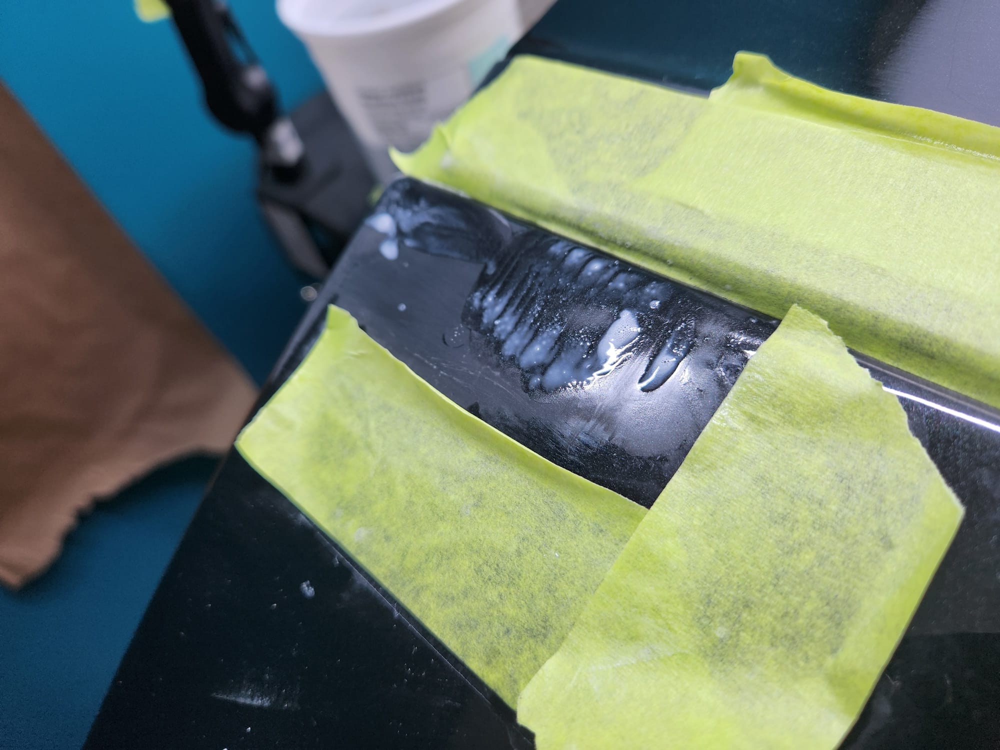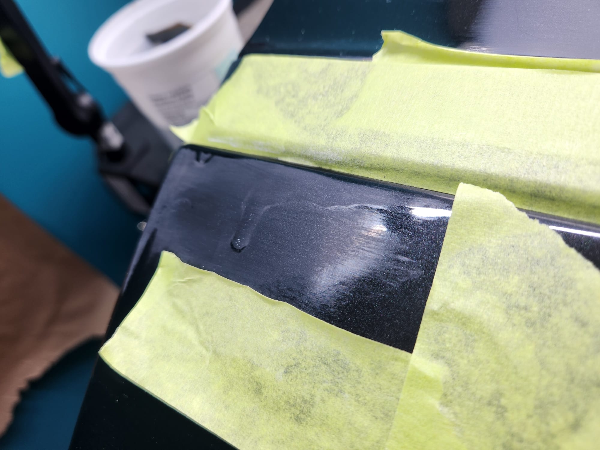 - Put tape around the major scratches and sanded with 3000 grit sandpaper. I tried to alternate between horizontal only and vertical only sets of sanding stages, checking if the previous stages marks were gone, allowing me to sand evenly. I was looking for a uniform haze which can later be polished out and the scratches would be gone.