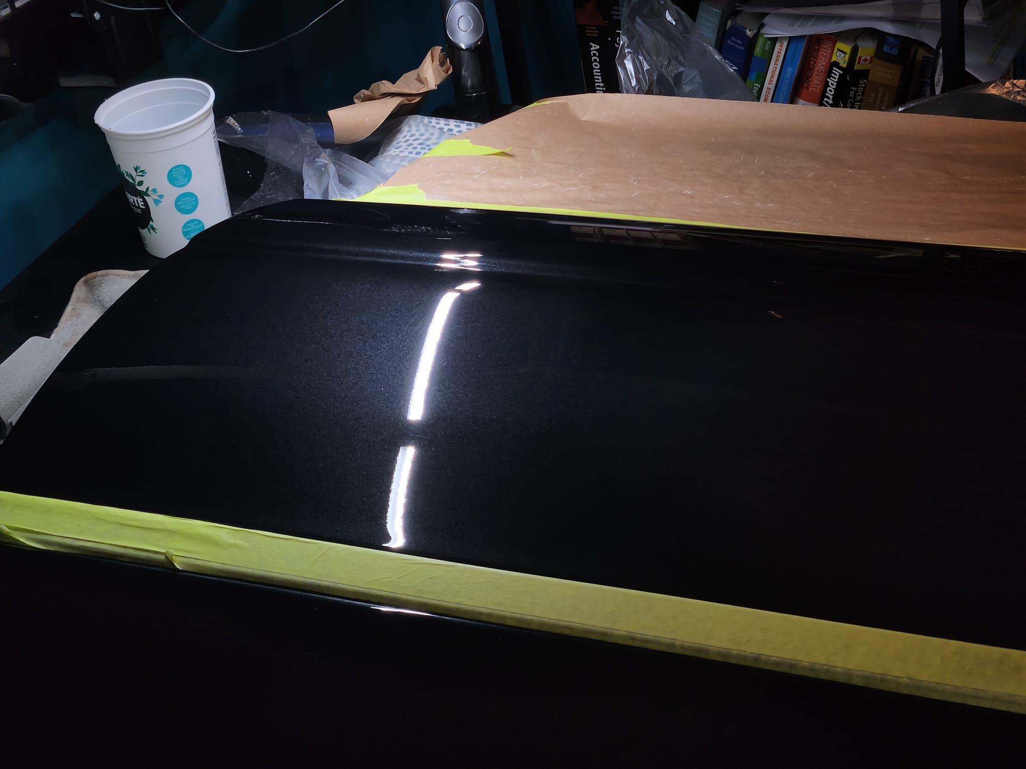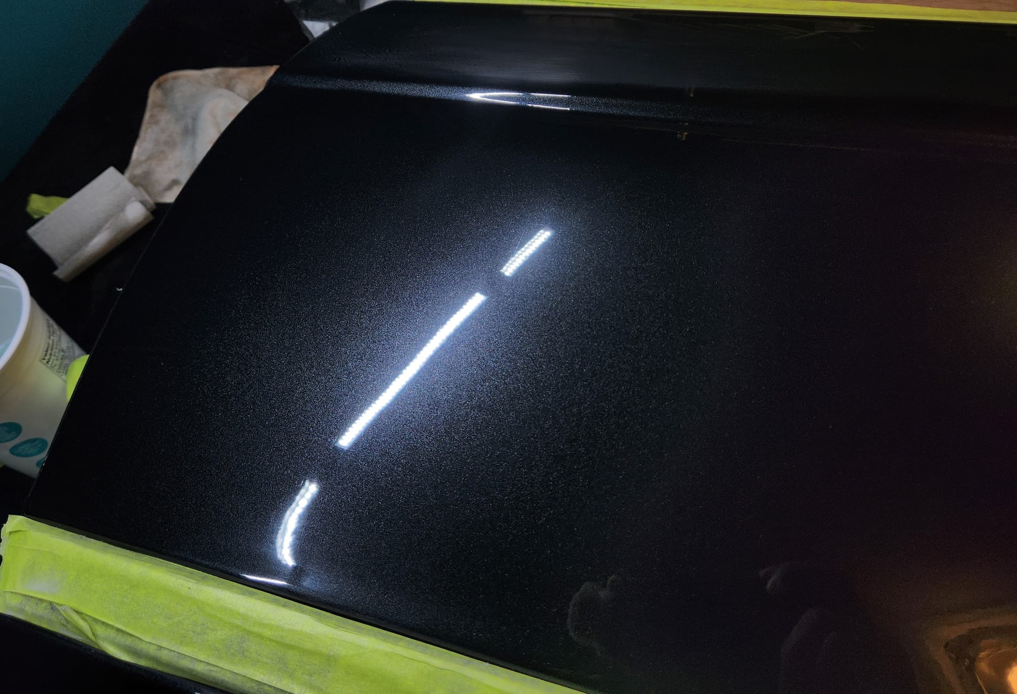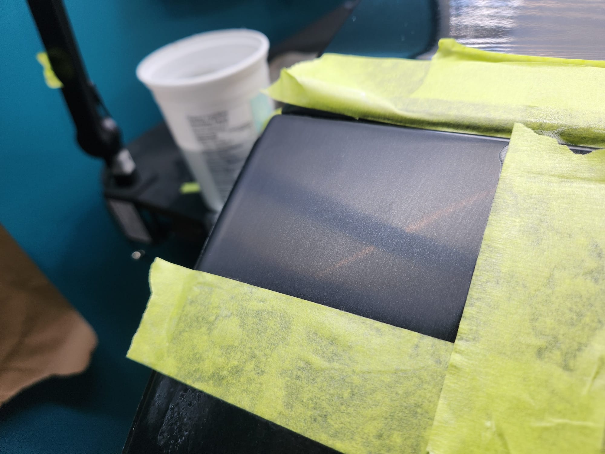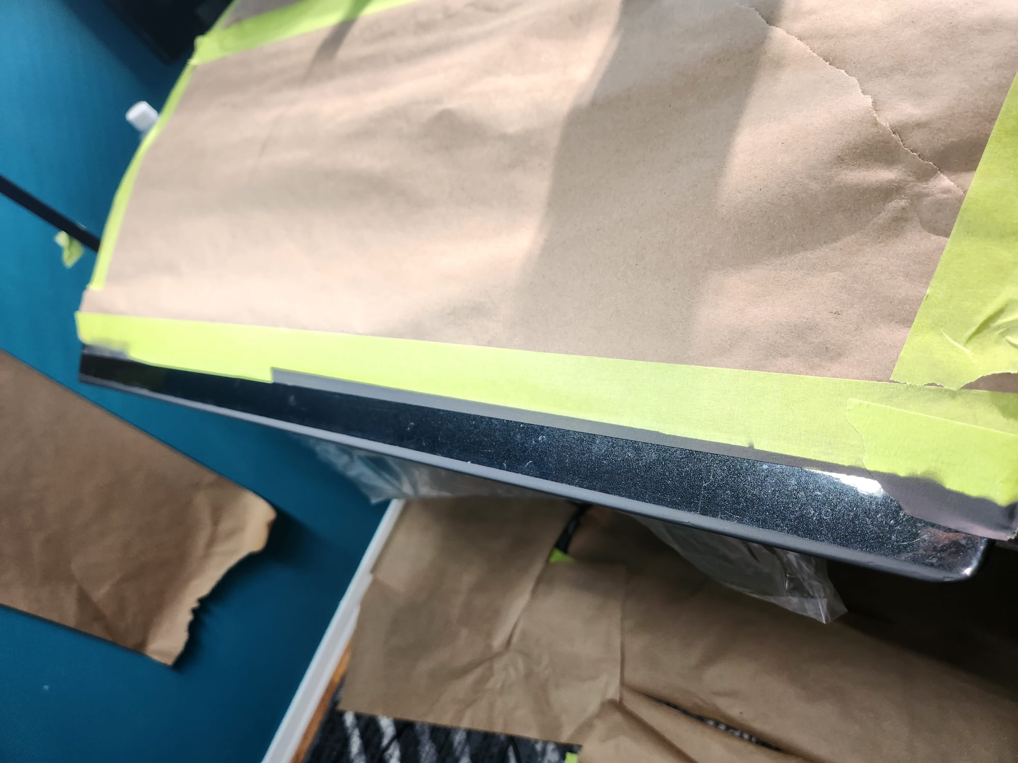 - Put tape around the major scratches and sanded with 3000 grit sandpaper. I tried to alternate between horizontal only and vertical only sets of sanding stages, checking if the previous stages marks were gone, allowing me to sand evenly. I was looking for a uniform haze which can later be polished out and the scratches would be gone.