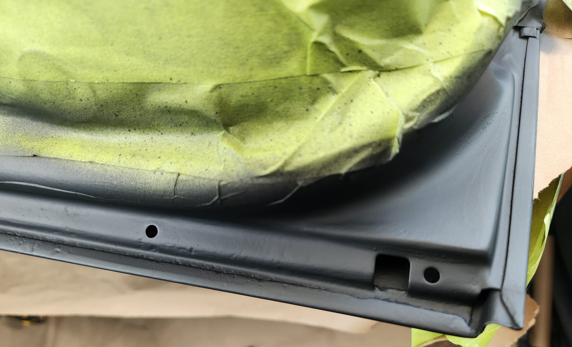 - Reviewing and Proceeding: Examined the results of the flat black rust reformer paint on one side, then flipped the door over to apply the same treatment to the other side.