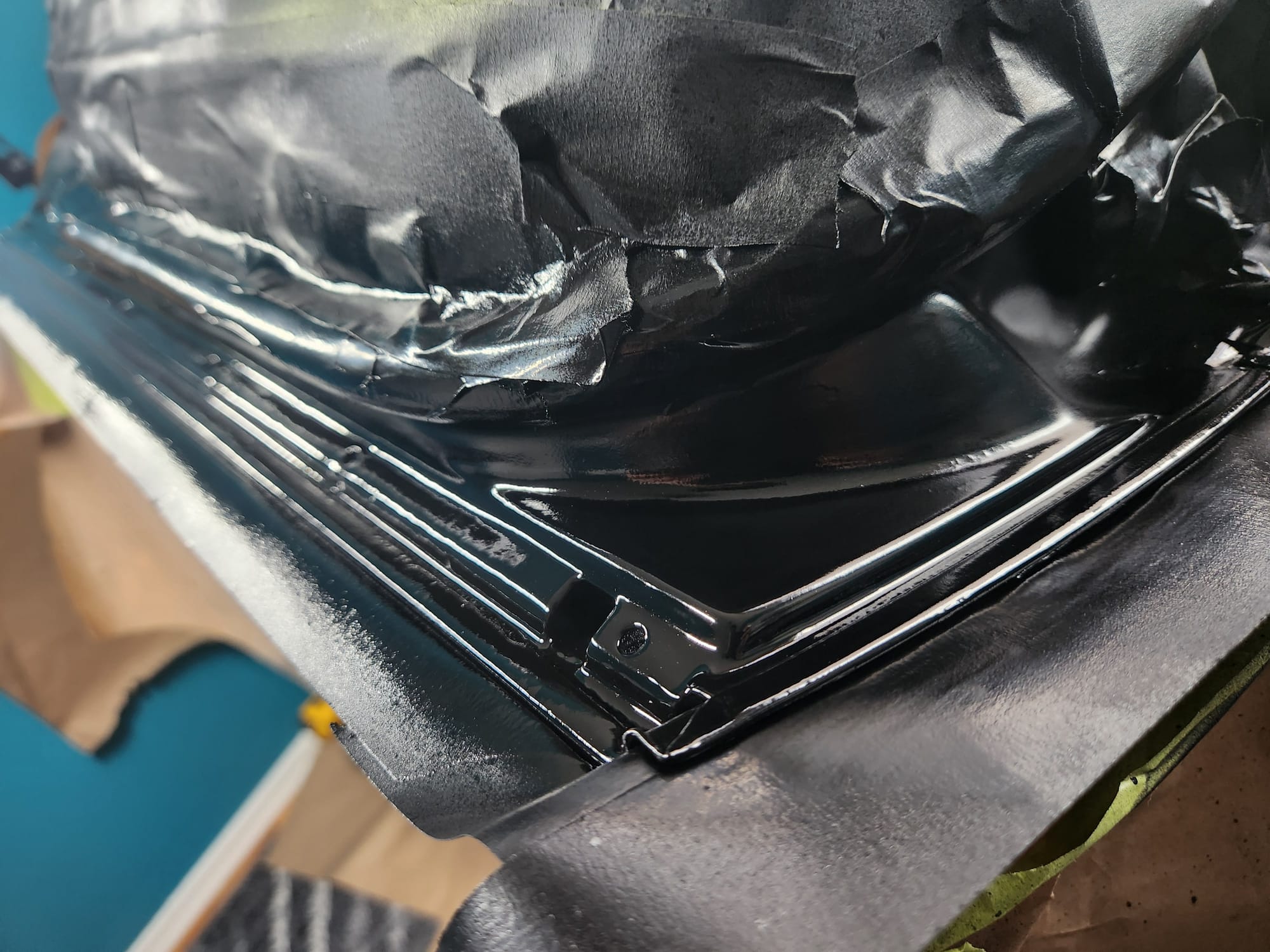 - Painting the Inner Side: Before painting, the inner side was well prepped, showing minor pitting from rust but otherwise in good condition. Applied flat black rust reformer spray in two coats: a light first coat, then a heavier second. Waited 24 hours. Then, added three coats of primer, three coats of gloss black, and three coats of clear, with a 10-minute interval between each for proper drying. I employed the technique of soaking the clear coat canister in hot tap water, inspired by the reputable ChrisFix YouTube channel. Though it seemed risky, further research confirmed its benefits. Heating the clear coat reduces its viscosity, allowing for a smoother application and a better finish from the spray can.