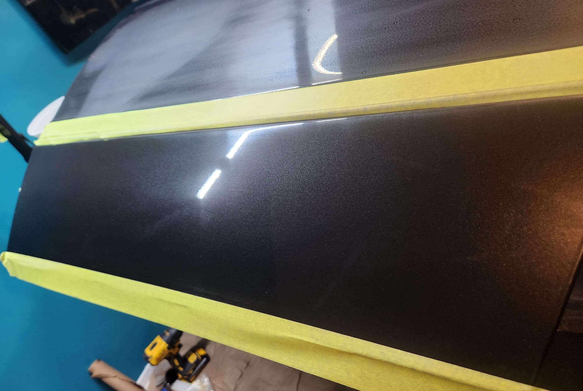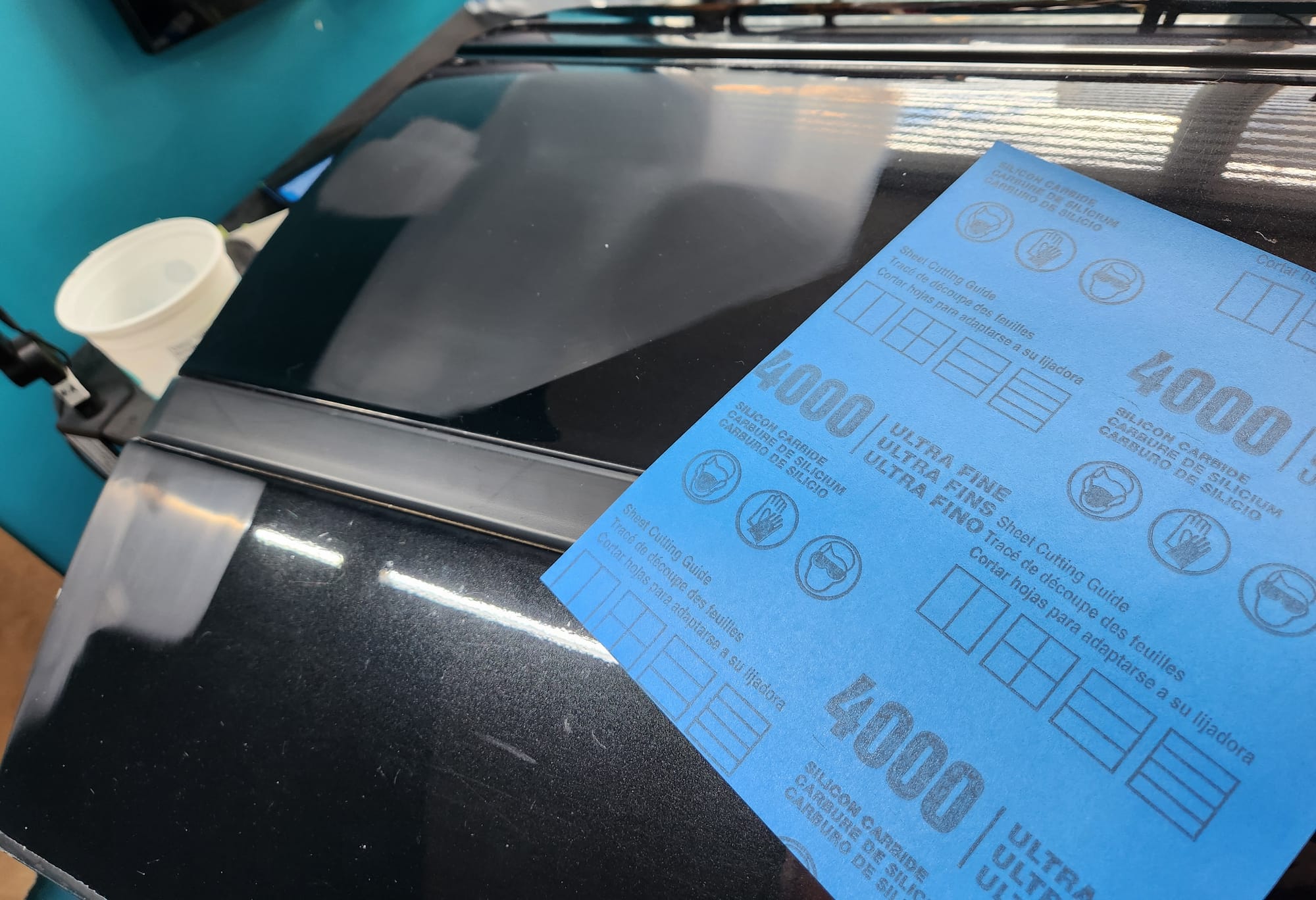 - Good enough. I moved forward. Now, I had two areas with 3000 grit sanding marks, while the rest of the door remained untouched. At this point, I could have started with the buffer, but to speed up the process, I applied 4000 grit sandpaper to the entire two sections. By hazing the door with 4000 grit, it would turn out much better once buffed, with a lower chance of the sanded areas standing out — this is a blending technique. Sanding with 4000 grit also eliminates 'orange peel.' Orange peel refers to a finish where the paint doesn't smooth out completely flat but instead has a subtle texture resembling an orange's skin. Even new cars typically have some degree of orange peel. By removing it here with the 4000 grit, I achieved a true near mirror-like finish.