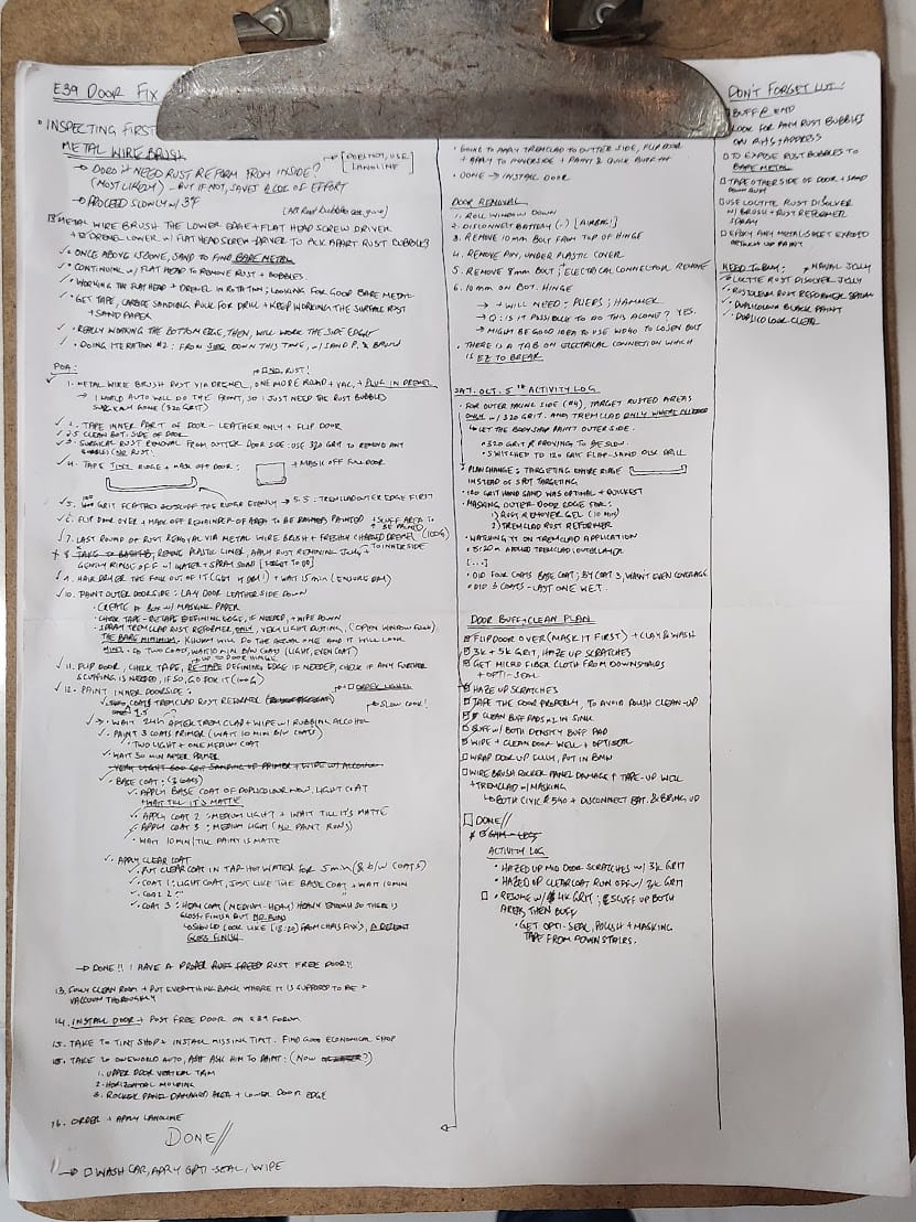 Since it was my first time with rust repair. I used a technique I call the Think on Paper technique. Pretty simple but it works. Specifically, I call it the To Do List + Activity Log Method.